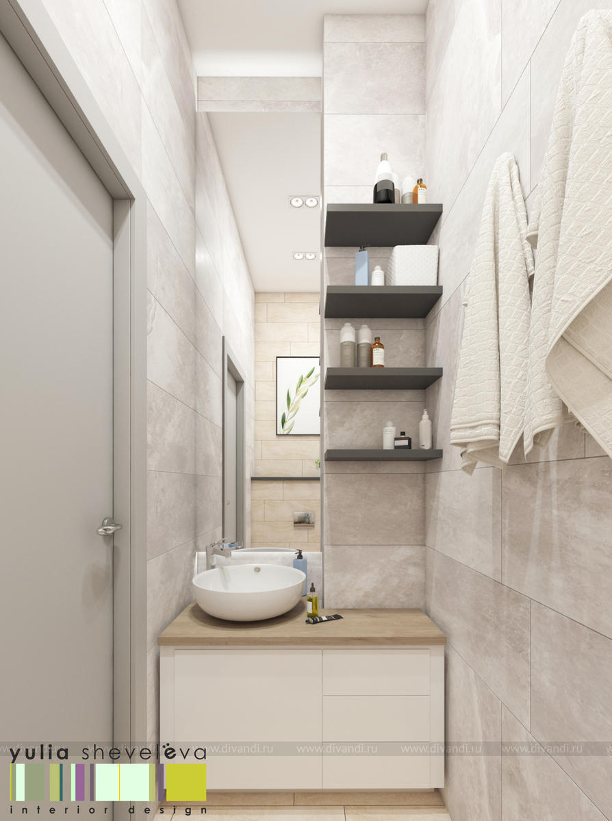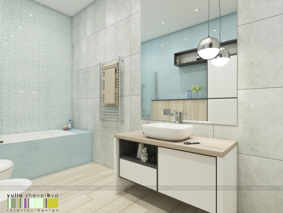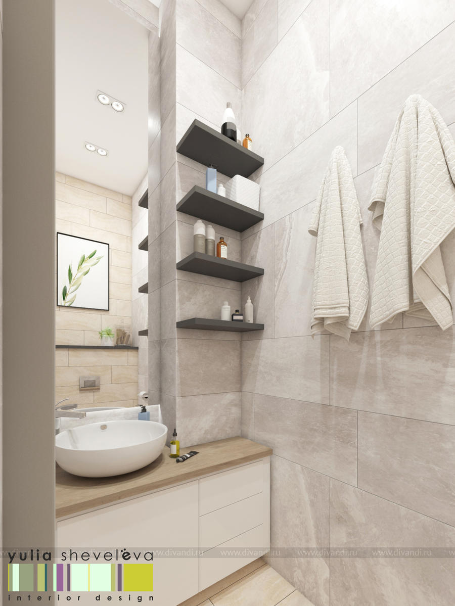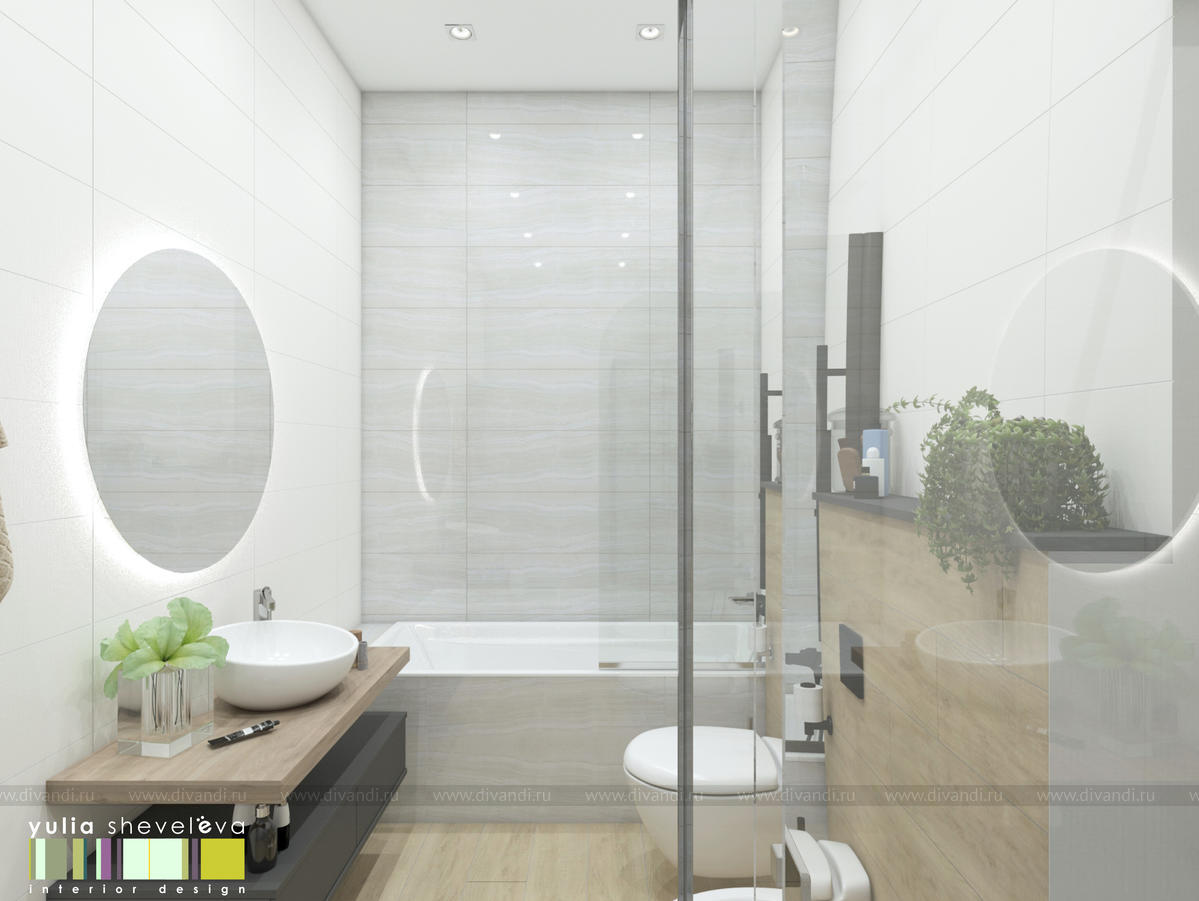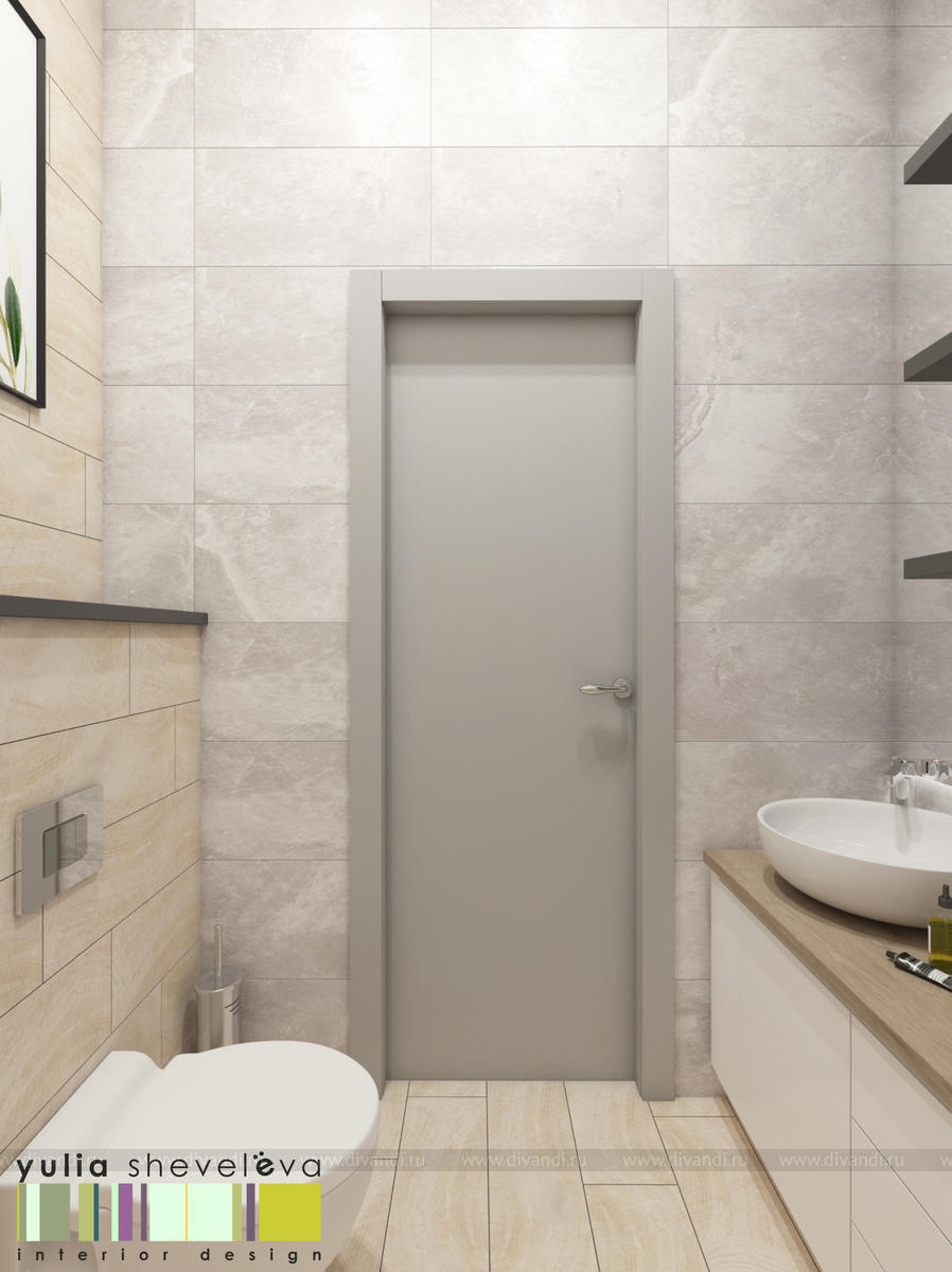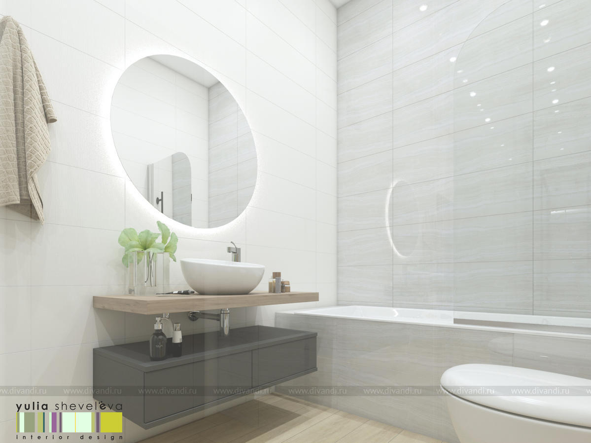 Интерьер дома было решено выполнить в современном стиле, с яркими акцентами и не перегруженного деталями в то же время. На первом этаже расположились гостиная и кухня, гостевой санузел. Здесь очень хорошая высота потолка - около четырёх метров, очень хотелось ее подчеркнуть красивыми интерьерными решениями. Так появились деревянные панели с зеркальными вставками и панно, имитирующее натуральный мрамор. Кухня-столовая спряталась за раздвижными дверцами.