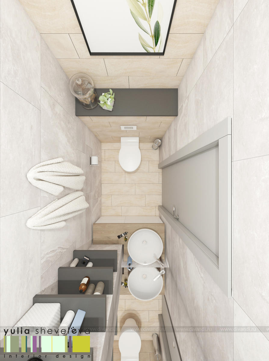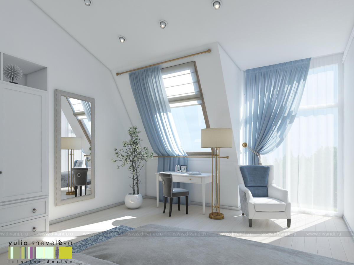На втором этаже расположились спальная комната, совмещенная с небольшим кабинетом и детская комната. Благодаря хорошему архитектурному решению и большой площади самого объекта, удалось при каждой спальной сделать отдельную ванную и свою приватную гардеробную комнату.