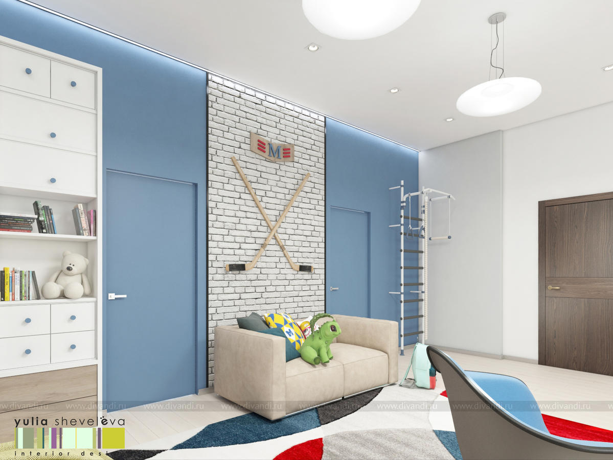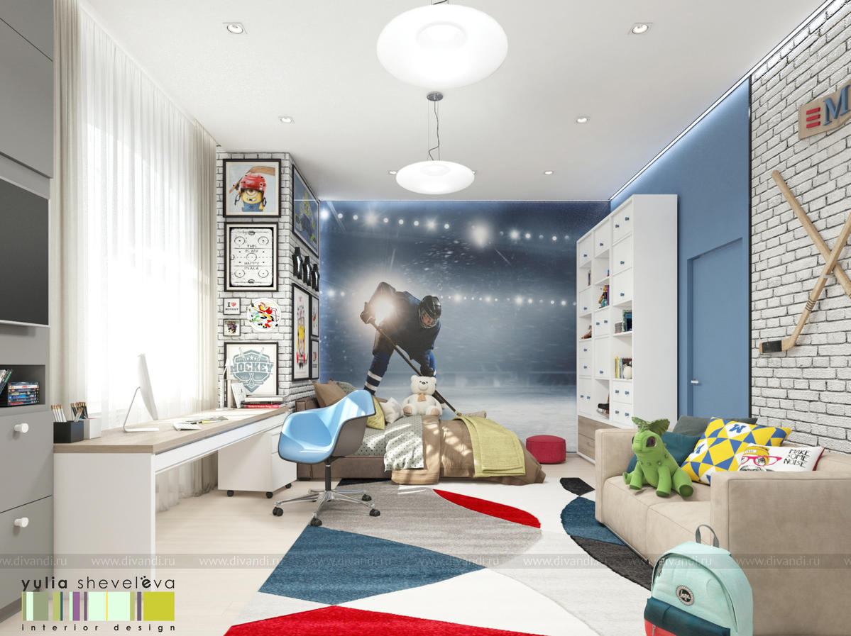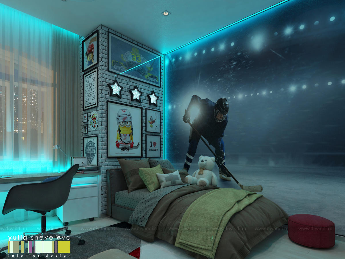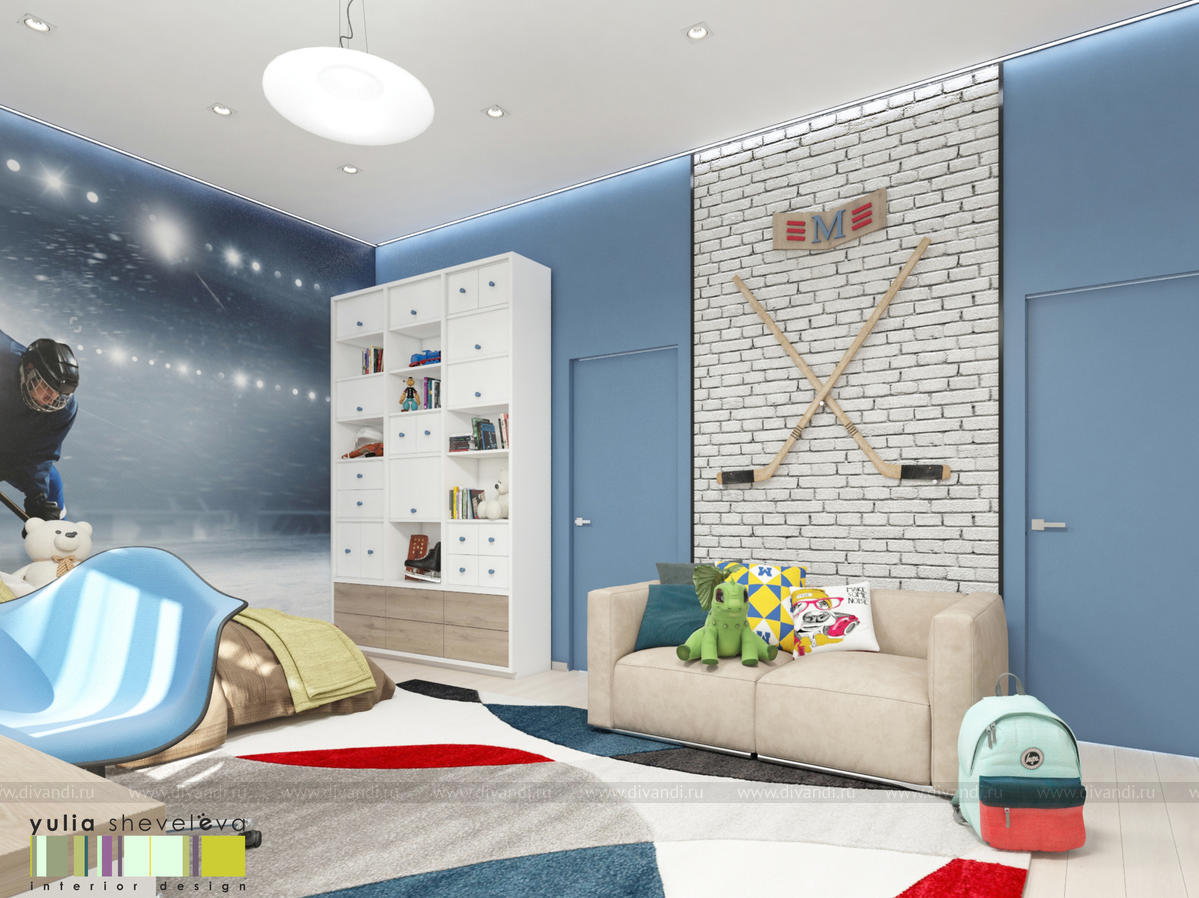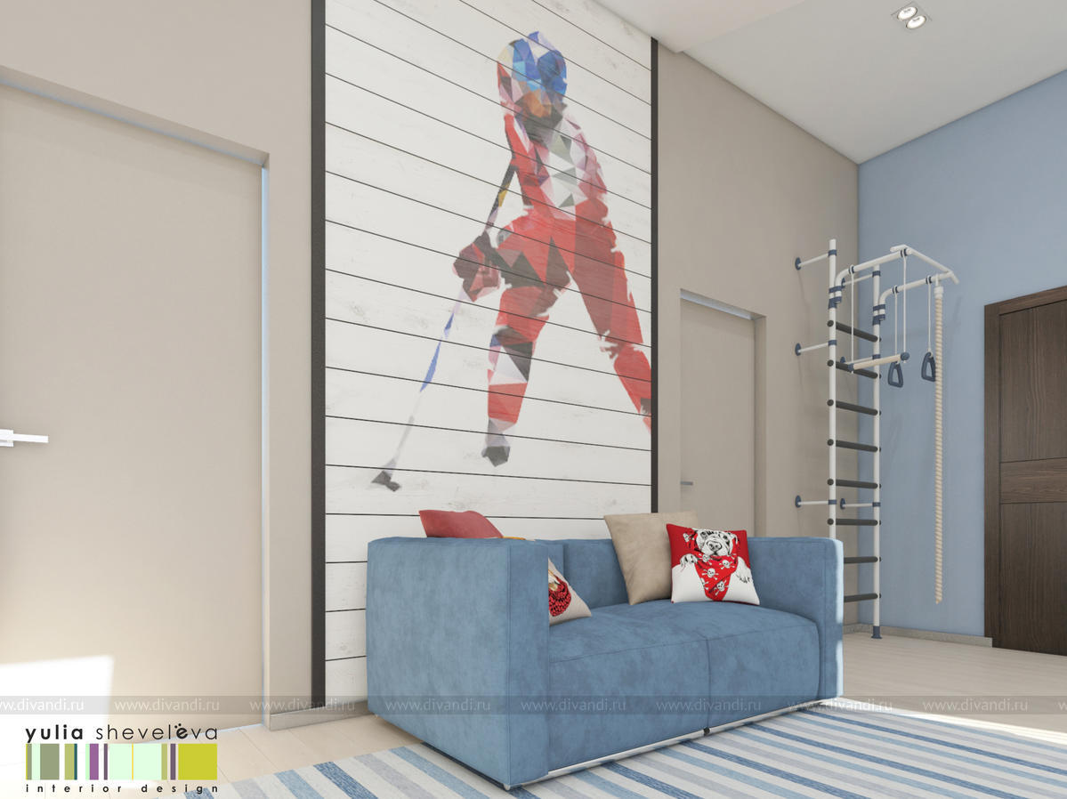 В доме есть ещё цокольный этаж. Здесь будет расположен ледовый корт, небольшой спортзал, сауна, хамам, прачечная и технические помещения. Детские комнаты предназначены для трех сыновей и оформлены все в едином стиле. Все мальчики увлекаются спортом, занимаются хоккеем. Несмотря на сложное, многофункциональное пространство, все помещения удалось выдержать в одном направлении, разбавив колористическими комбинациями и разными приёмами в оформлении.
