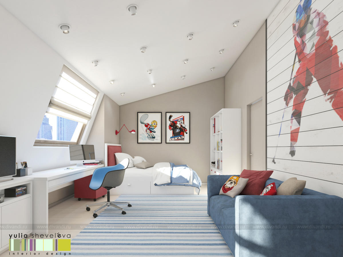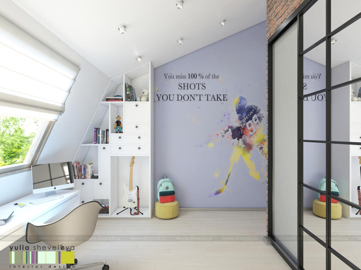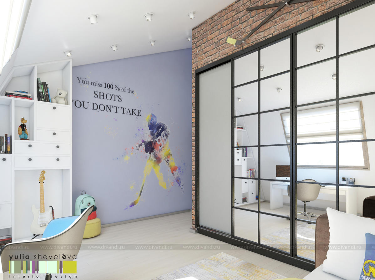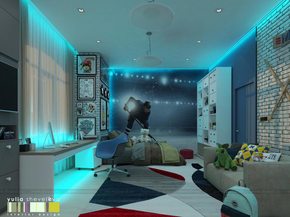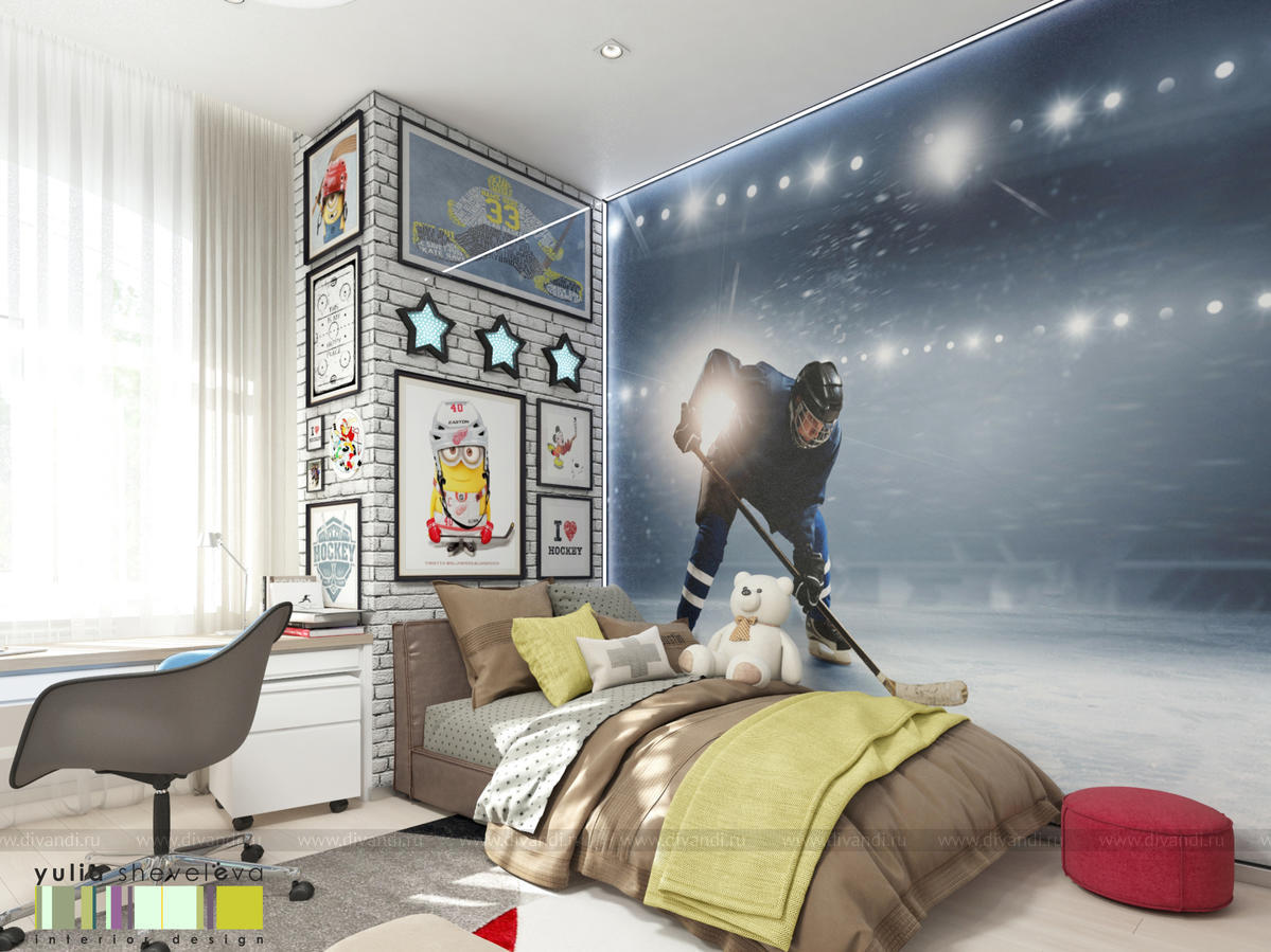 В доме есть ещё цокольный этаж. Здесь будет расположен ледовый корт, небольшой спортзал, сауна, хамам, прачечная и технические помещения. Детские комнаты предназначены для трех сыновей и оформлены все в едином стиле. Все мальчики увлекаются спортом, занимаются хоккеем. Несмотря на сложное, многофункциональное пространство, все помещения удалось выдержать в одном направлении, разбавив колористическими комбинациями и разными приёмами в оформлении.