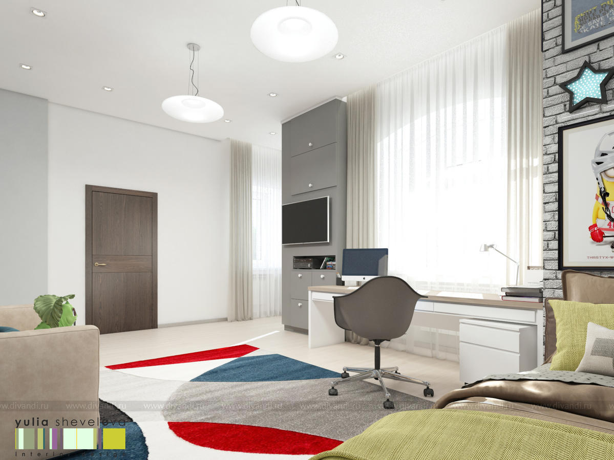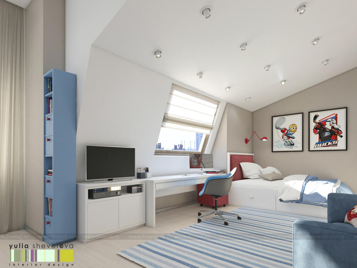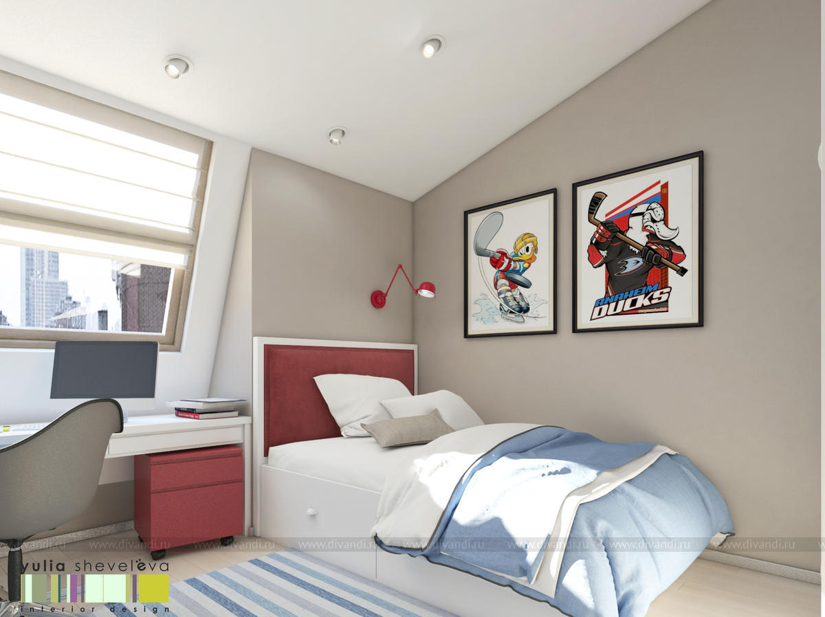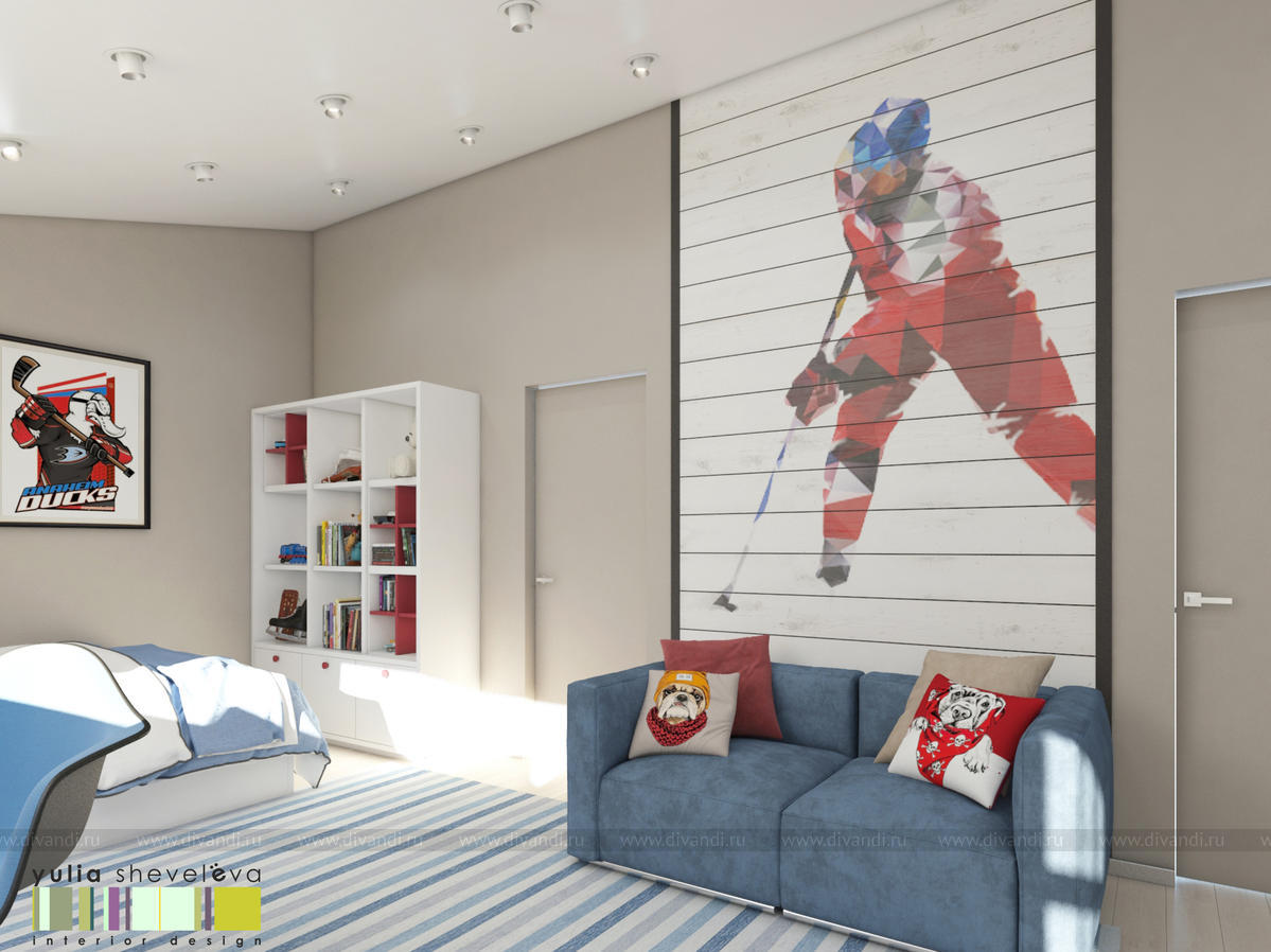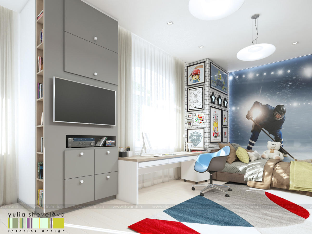 В доме есть ещё цокольный этаж. Здесь будет расположен ледовый корт, небольшой спортзал, сауна, хамам, прачечная и технические помещения. Детские комнаты предназначены для трех сыновей и оформлены все в едином стиле. Все мальчики увлекаются спортом, занимаются хоккеем. Несмотря на сложное, многофункциональное пространство, все помещения удалось выдержать в одном направлении, разбавив колористическими комбинациями и разными приёмами в оформлении.