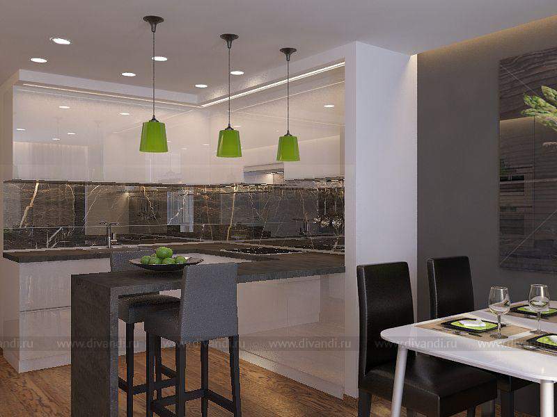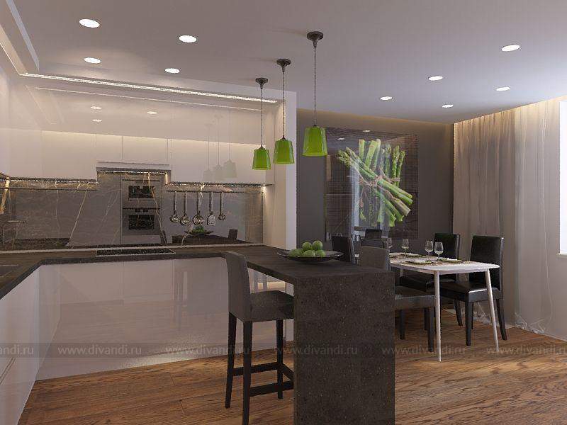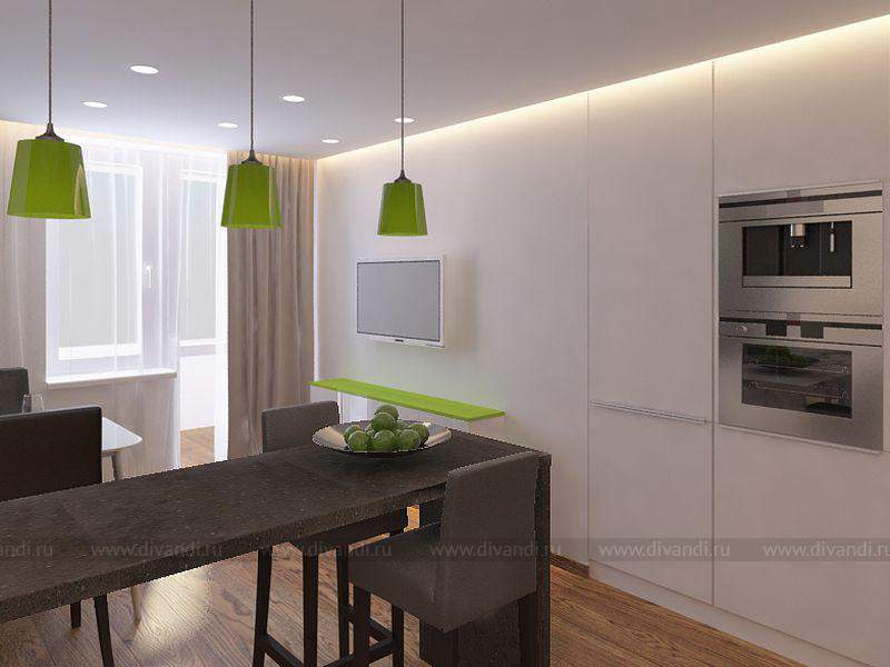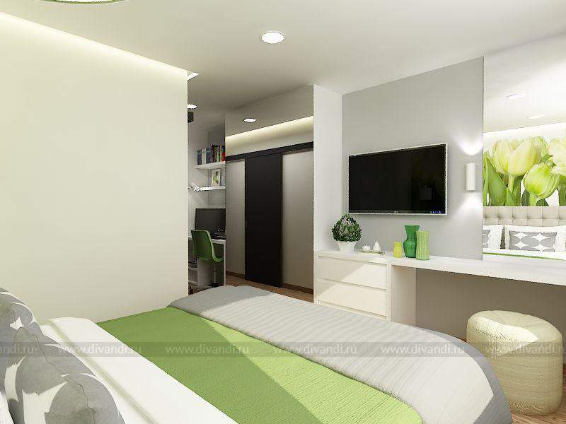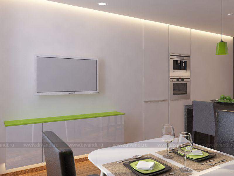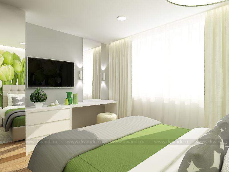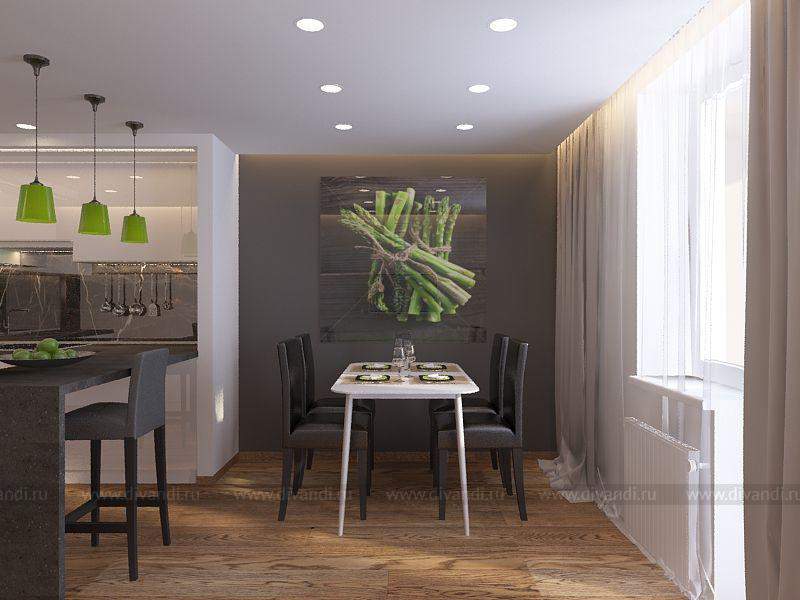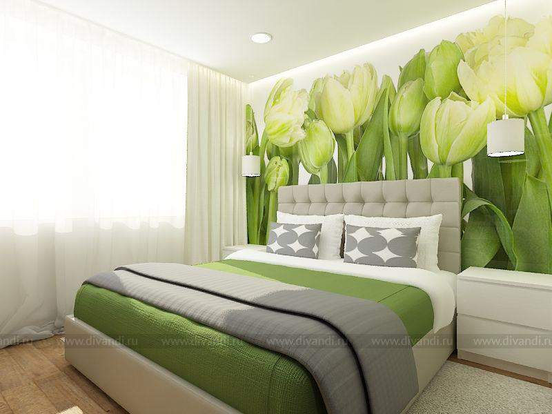 Проект по-настоящему весенний и жизнерадостный. Цветовая гамма интерьера основана на сочетании разных оттенков зеленого с серым и белым.