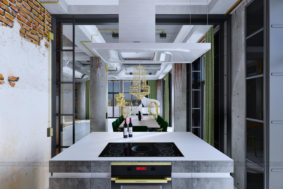 А каменная текстура пола и кухонного гарнитура, открытый бетон и кирпич с частично нанесенной штукатуркой заявляют о характере заглавной буквой!