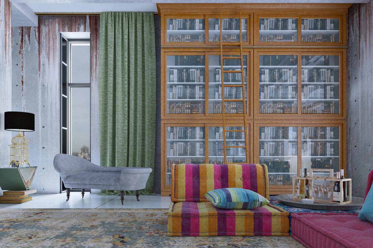 Винтажный ковер, велюровые шторы и мягкие пуфы добавляют тепла и уюта. Деревянные стол и шкафы библиотеки с собранием книг в твердом переплете привносят интерьеру солидности, а побеги молодого бамбука свежести и природности.