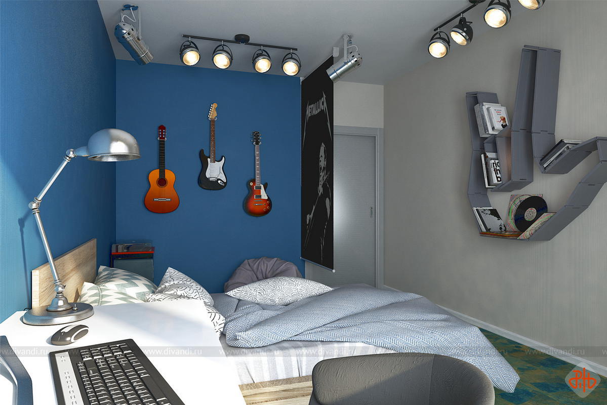 Комната подростка-сына смело оформлена и звукоизолирована, гитары и светомузыка умных ламп в прожекторах сделают счастливым любого взрослого ребенка.
