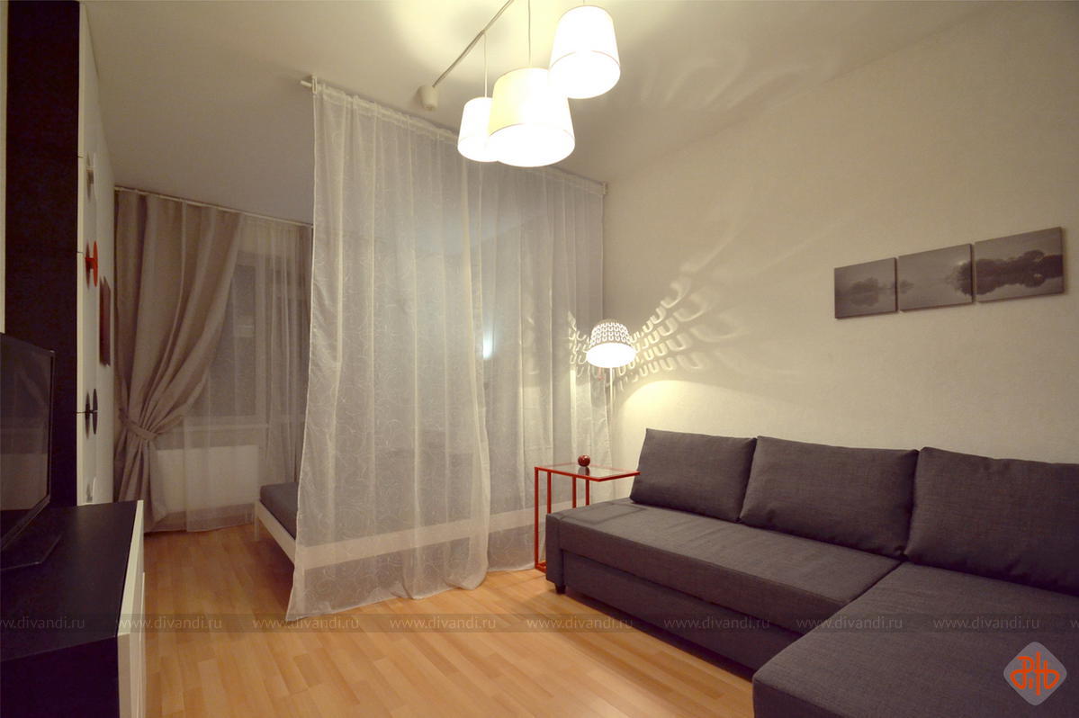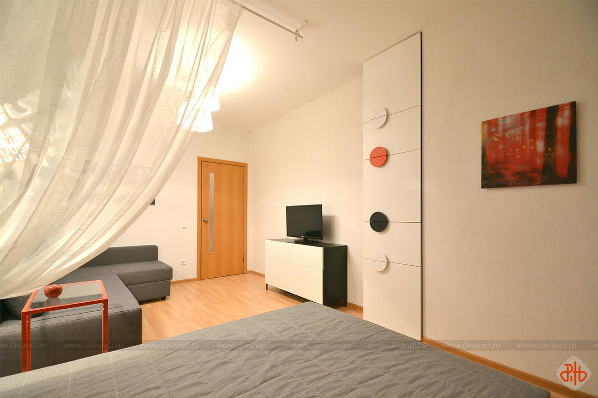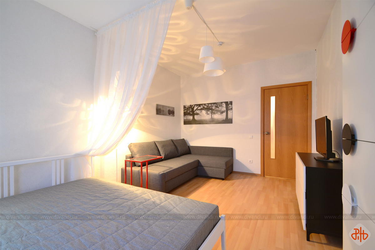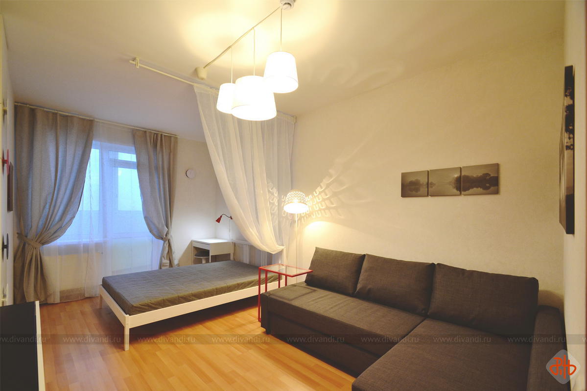 Реализованный экспресс-проект гостиной, совмещенной со спальней в квартире, предназначенной для дальнейшей аренды.