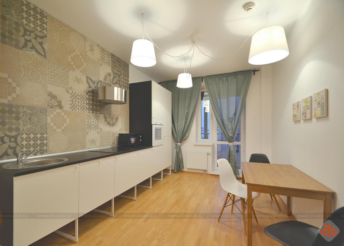 Кухонный гарнитур на ножках, фартук из крупноформатного керамогранита.