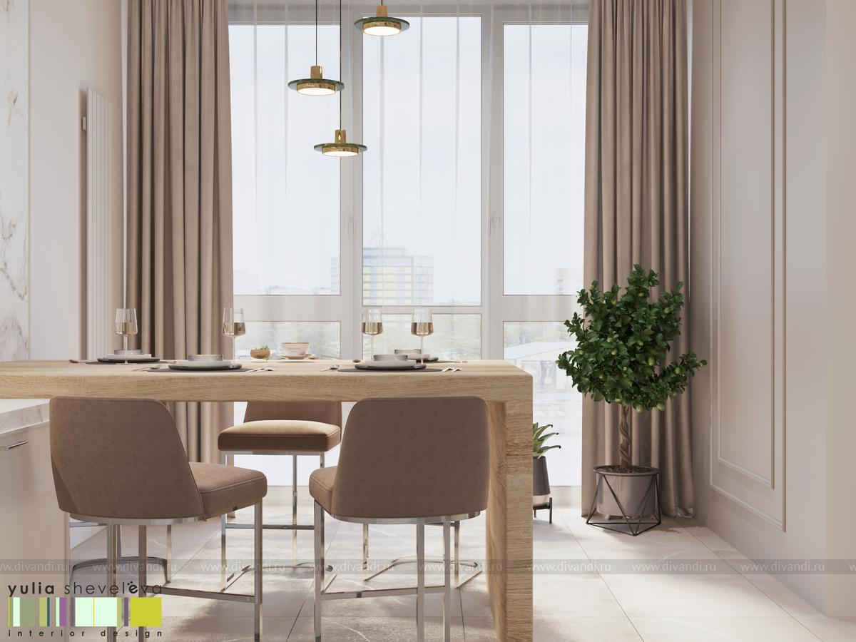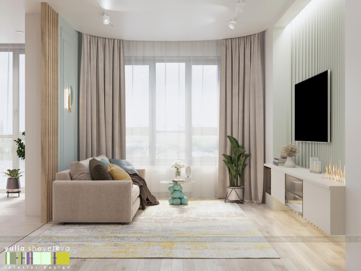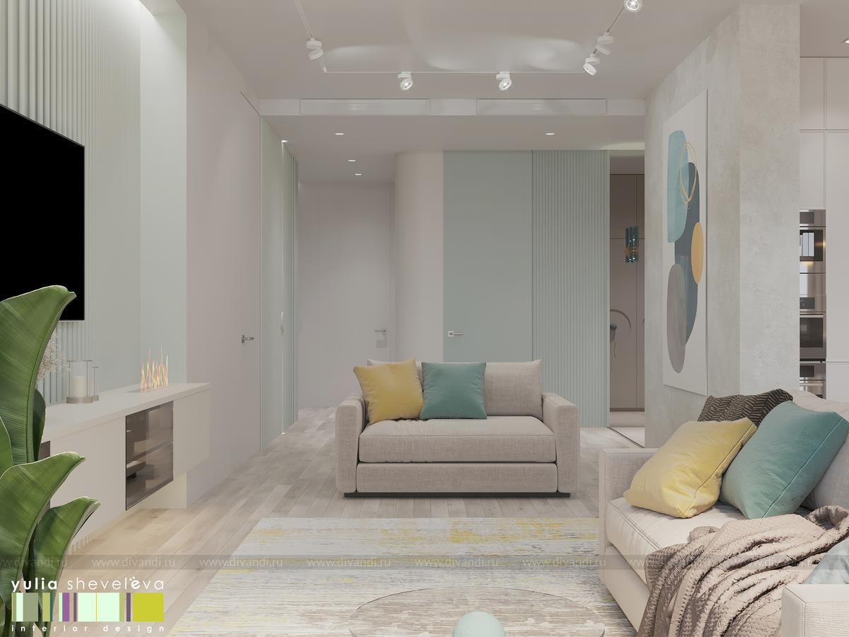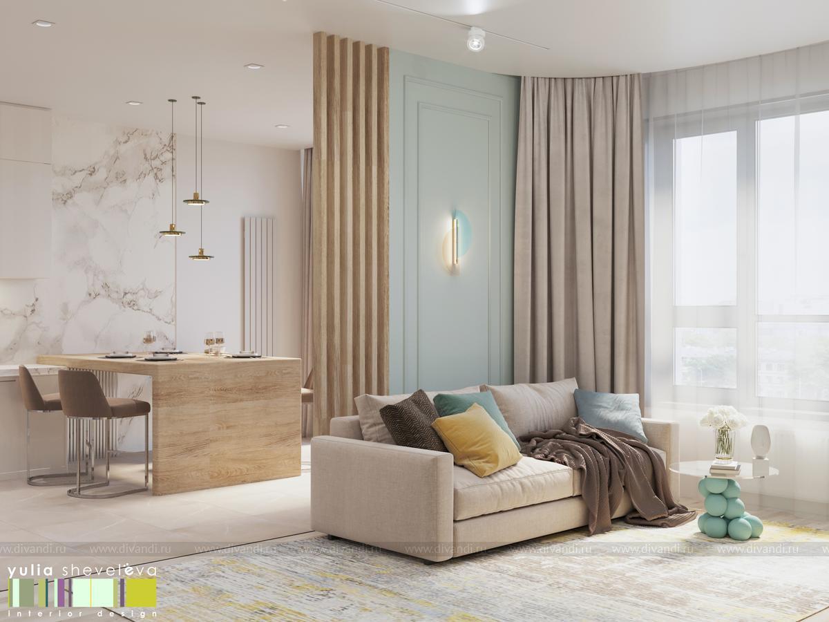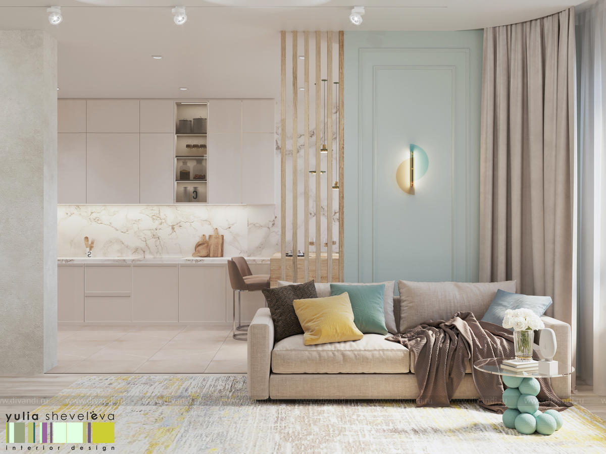 Интерьер квартиры выполнен в миксе минимализма и современной классики. Основу составляет теплая и нейтральная палитра, с легкими акцентами бирюзового, зеленого, розового и желтого оттенка. Никаких ярких и кричащих цветов, все построено только на полутонах.