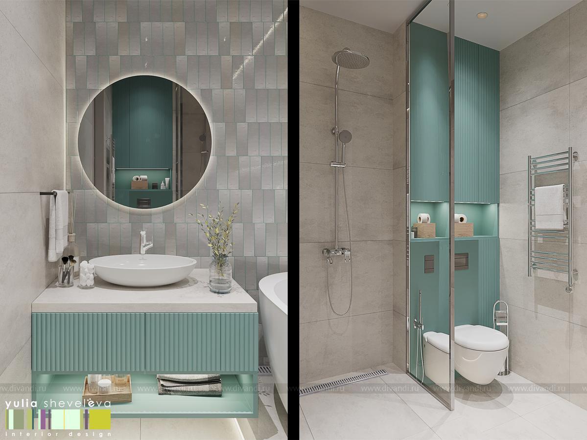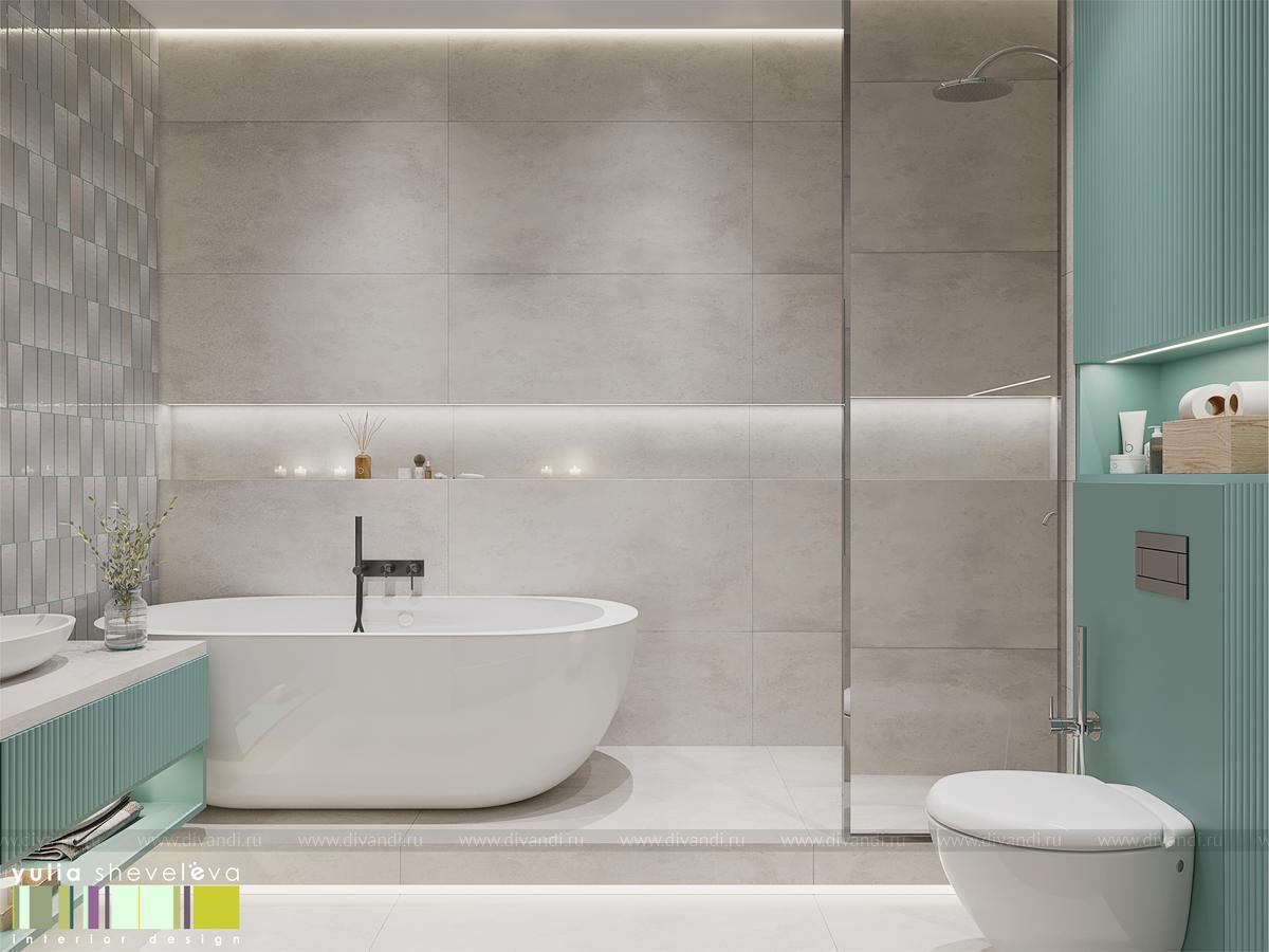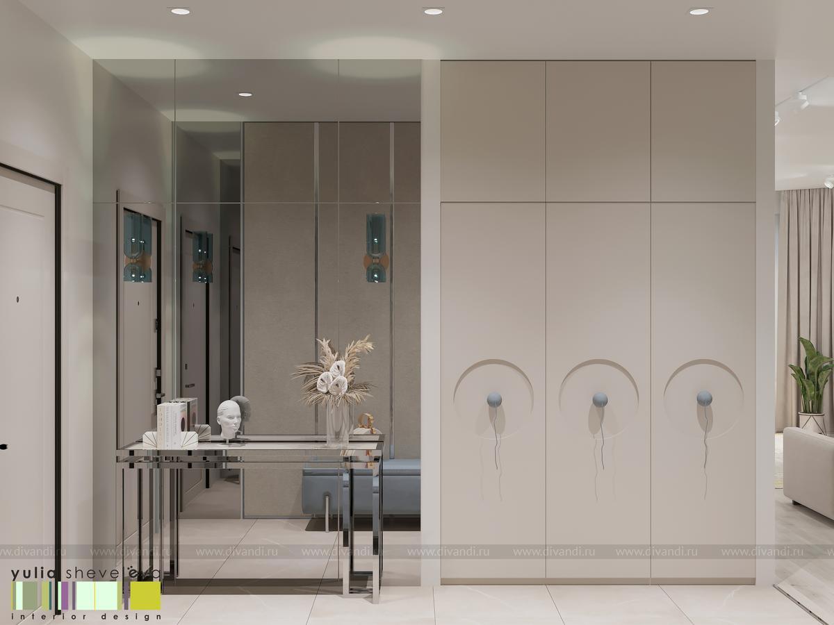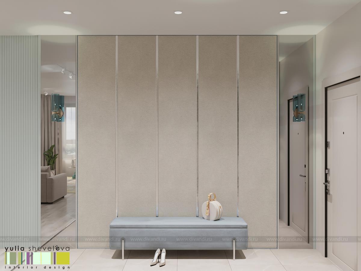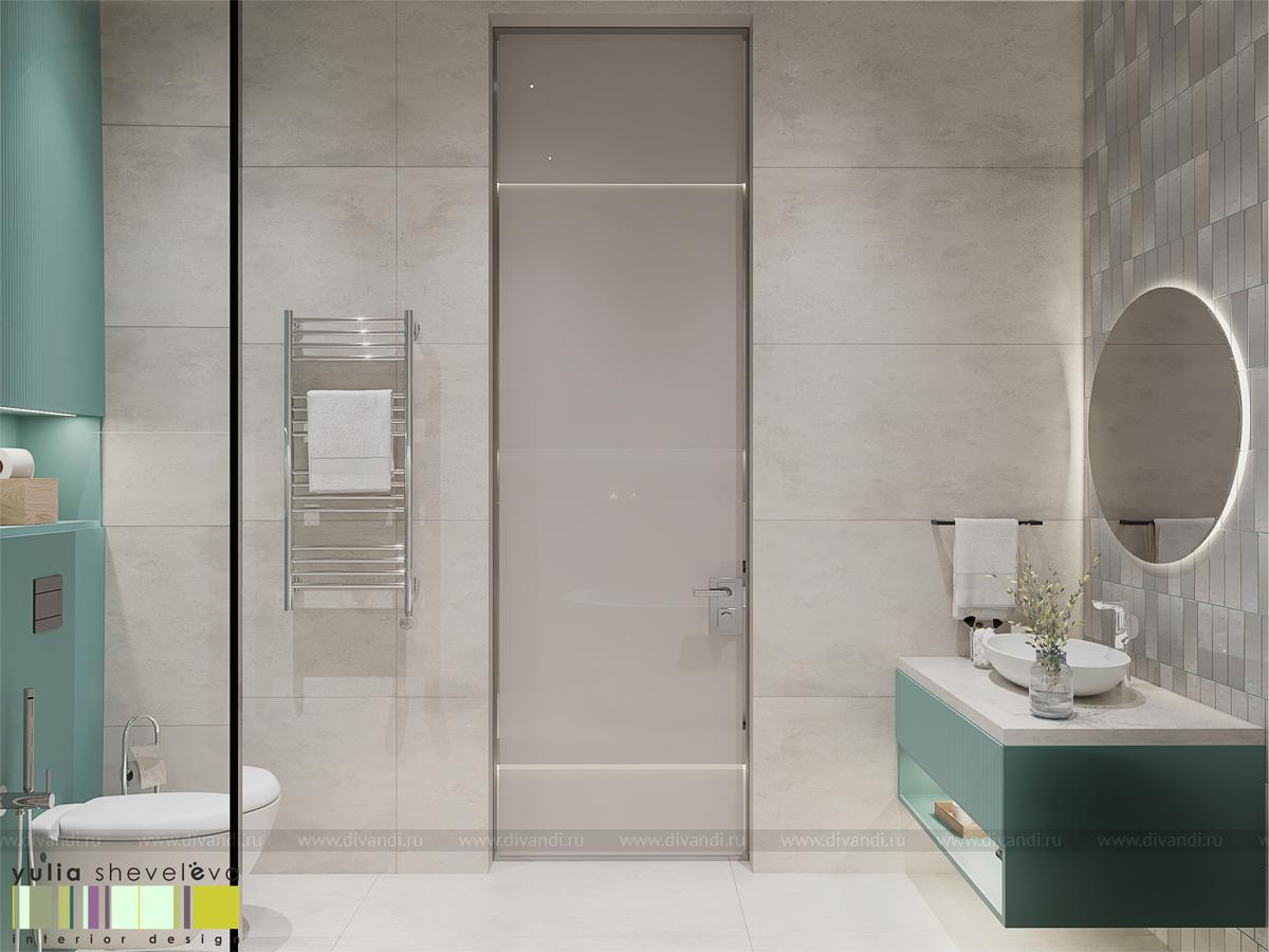 Интерьер квартиры выполнен в миксе минимализма и современной классики. Основу составляет теплая и нейтральная палитра, с легкими акцентами бирюзового, зеленого, розового и желтого оттенка. Никаких ярких и кричащих цветов, все построено только на полутонах.