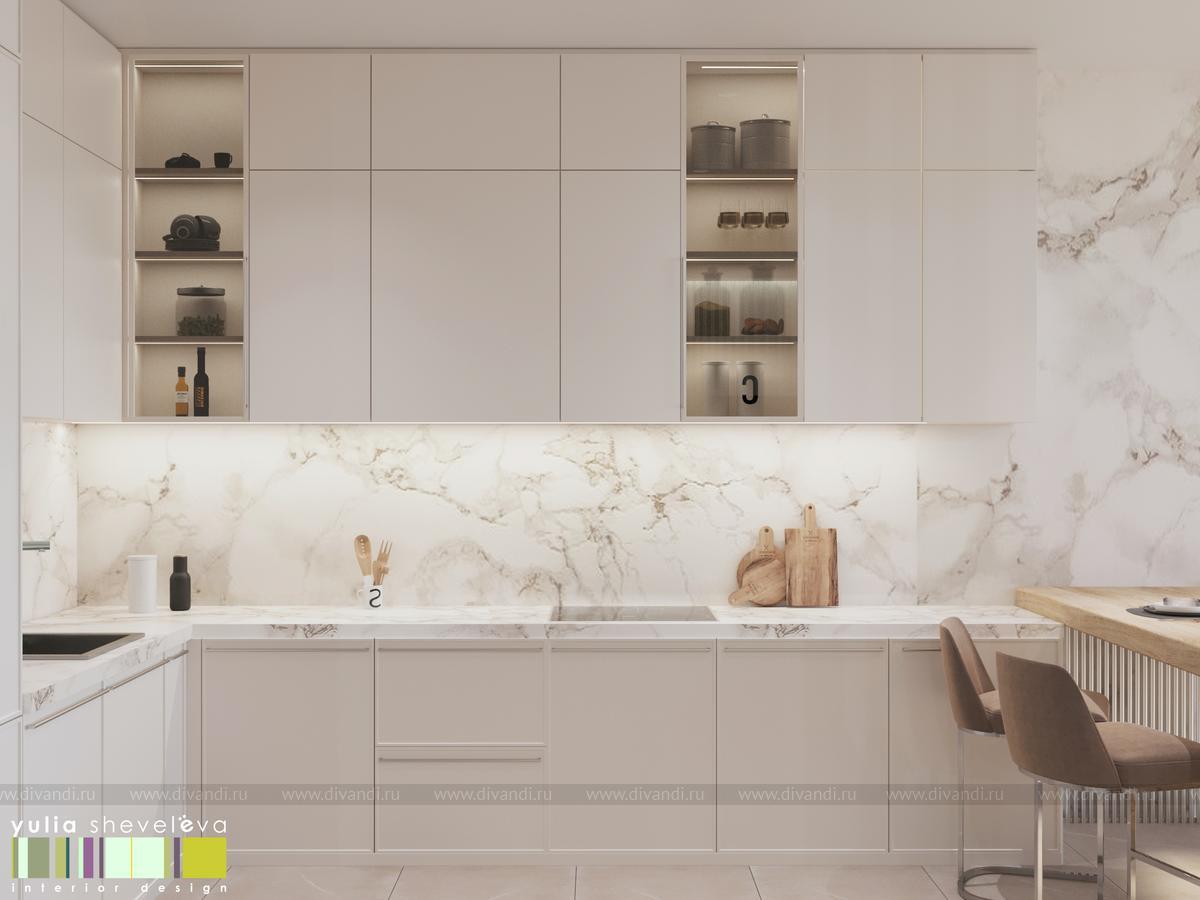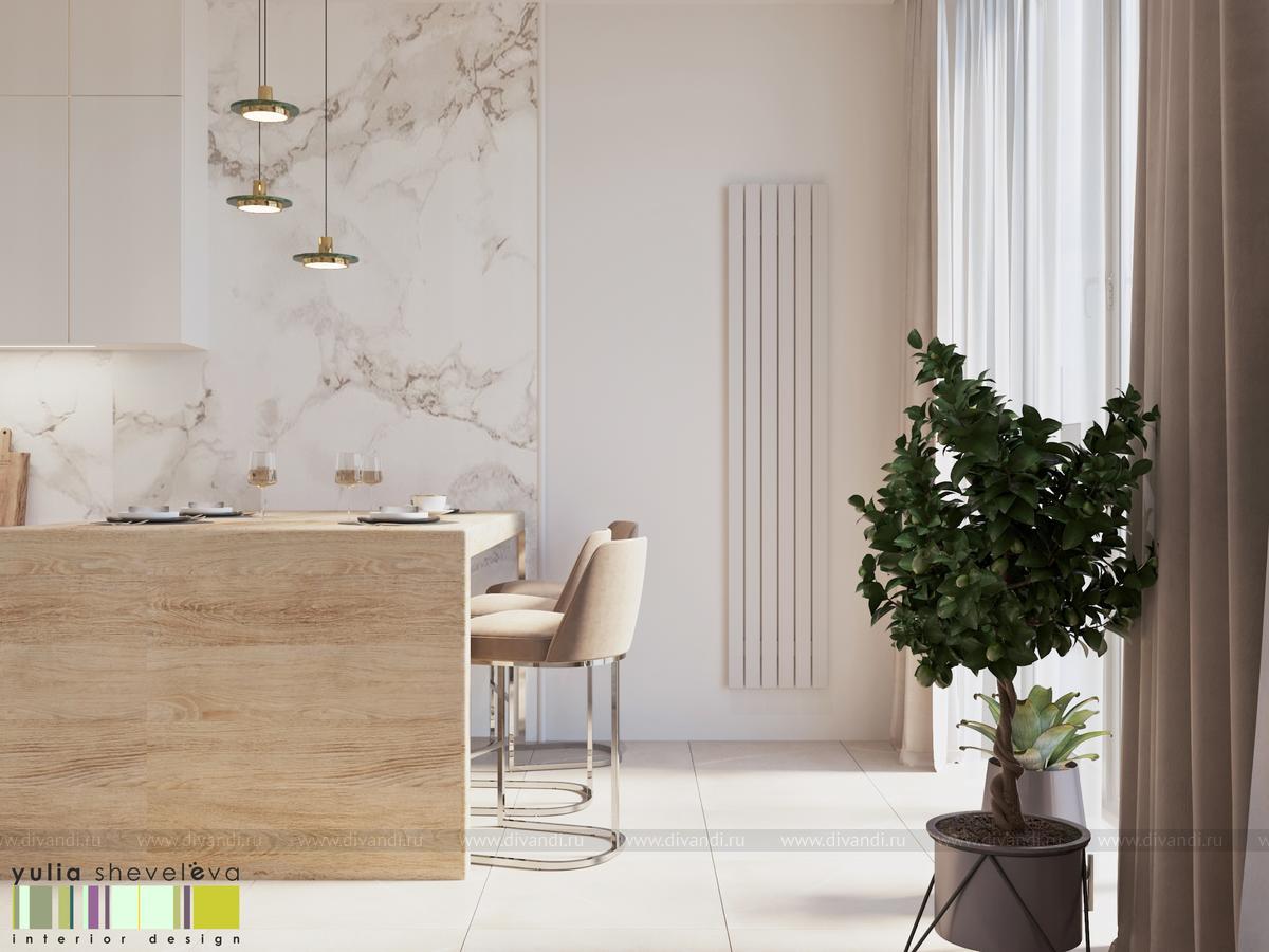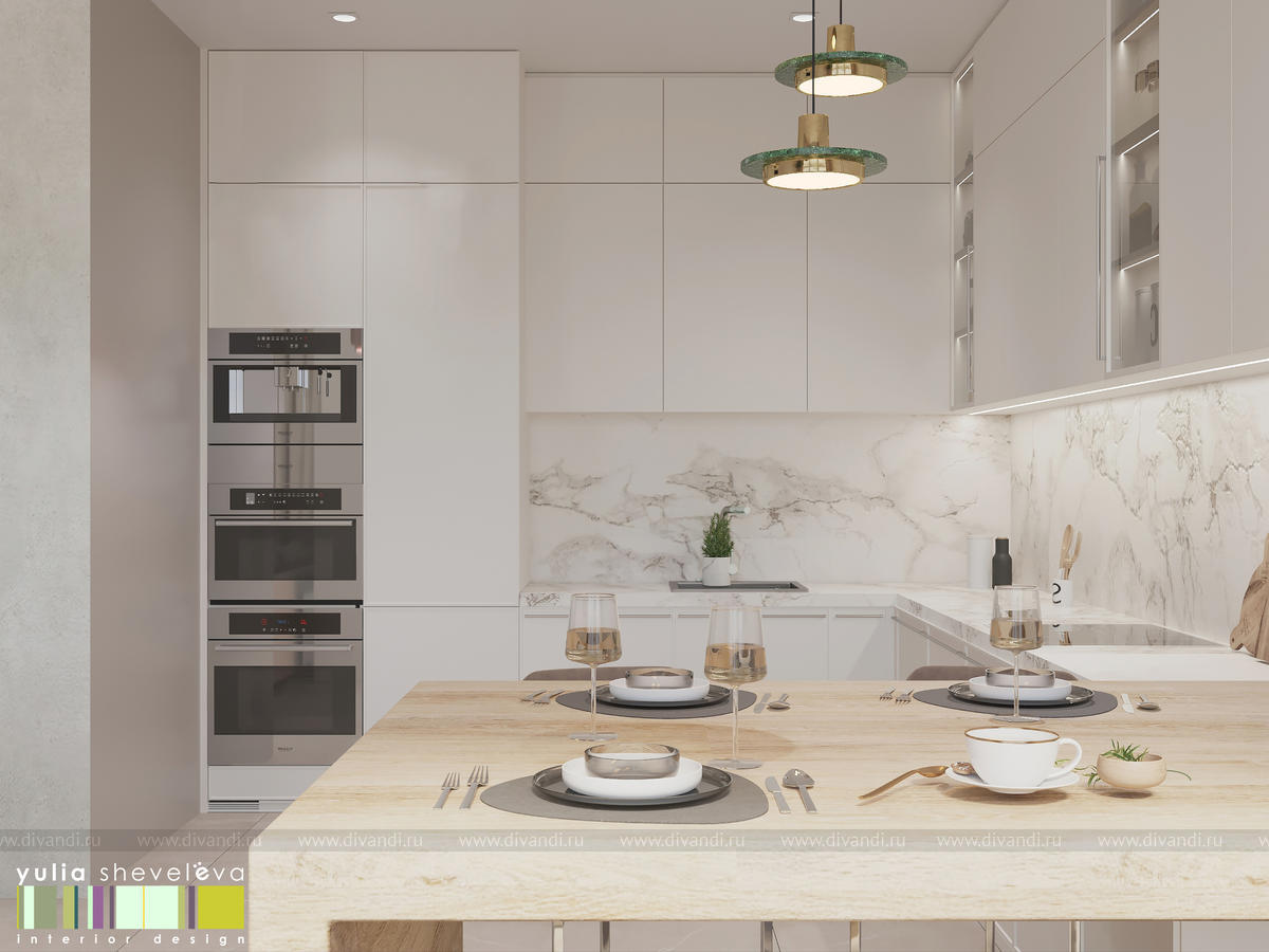 Просторная кухня-гостиная наполнена легкостью и светом. Вместительные системы хранения в зоне кухни, удобная мягкая мебель, обеденная зона с прекрасным видом из панорамного окна, уютный текстиль, комбинированное освещение, стильное сочетание различных текстур и фактур – все это формирует идеальный интерьер, в котором хочется жить…