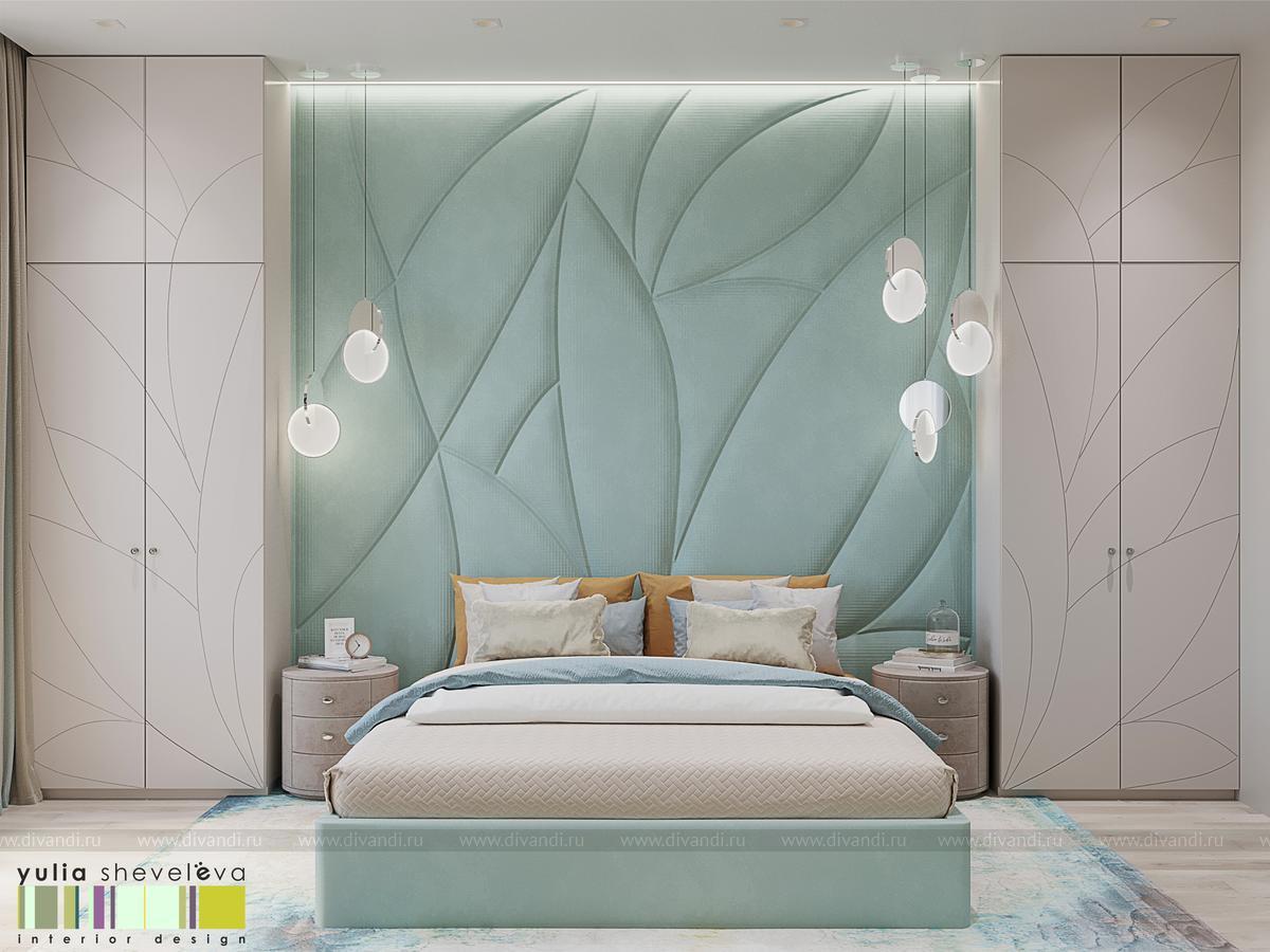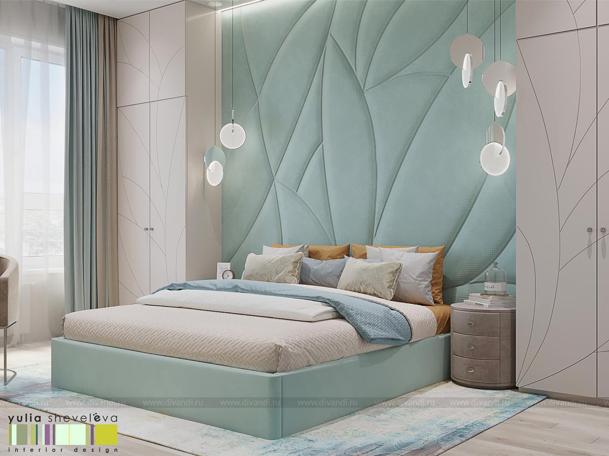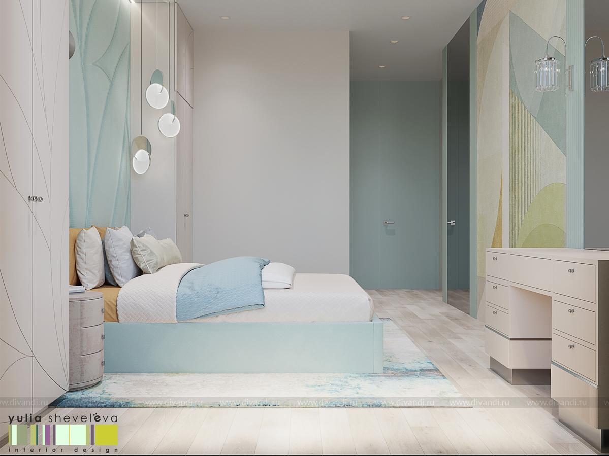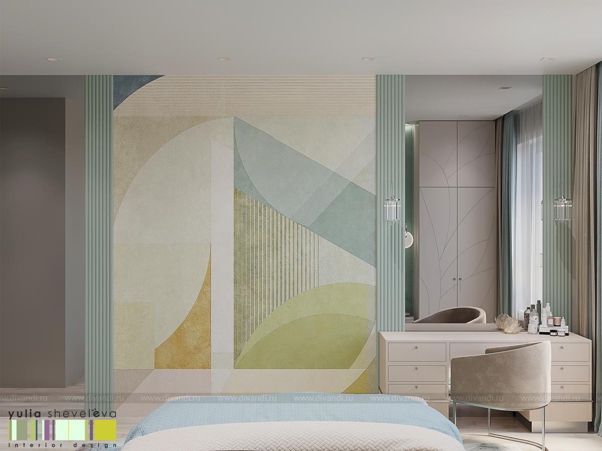 В центре композиции – уютная кровать, основание которой выполнена в тон с мягкими стеновыми панелями. По сторонам от кровати – элегантные тумбочки с фасадами из ткани. Над ними – стильные и лаконичные подвесные светильники из пересекающихся зеркальных дисков. Напротив расположили туалетный столик с уютным и удобным стулом.