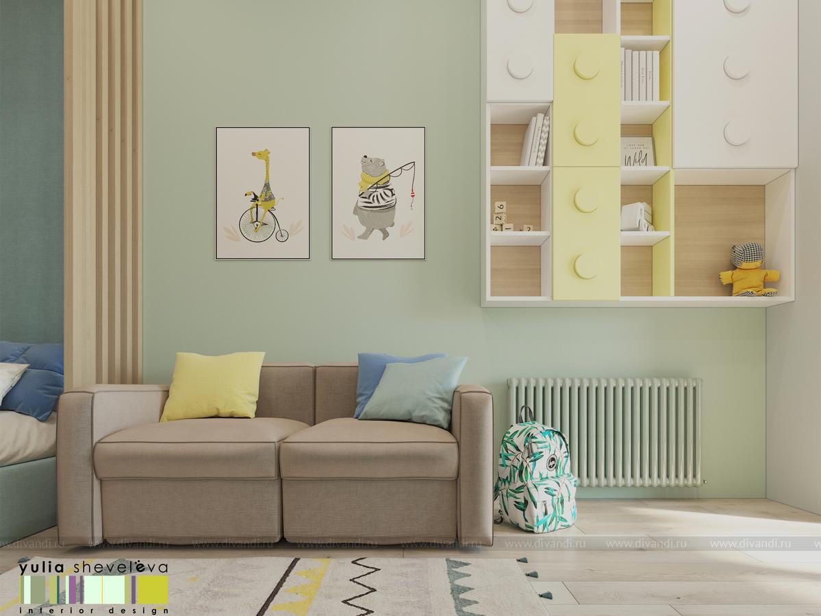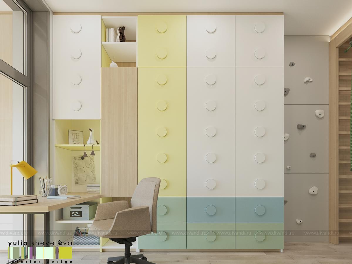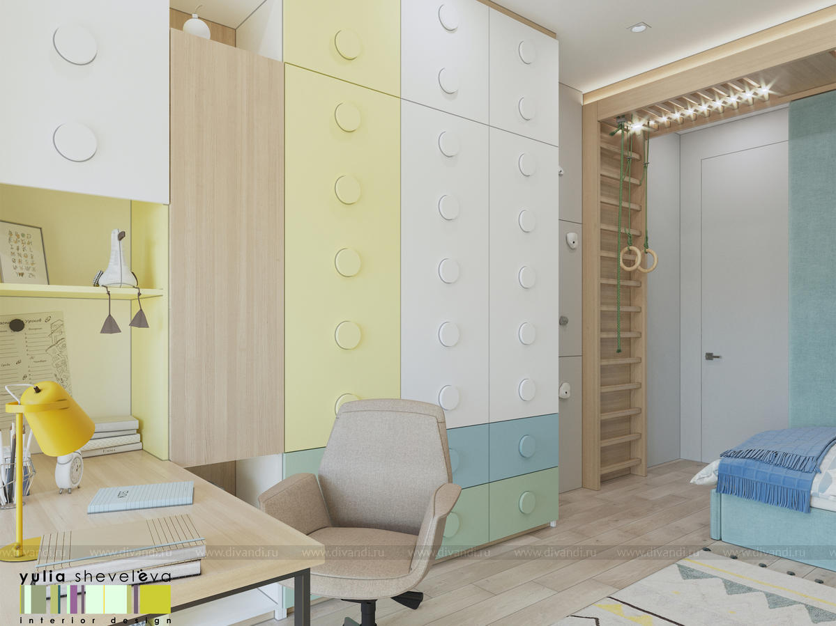 Детская комната для мальчика наполнена интересными решениями и стильными элементами в отделке, мебели и декоре. Площадь помещения позволила реализовать все, что необходимо для комфорта ребенка. Здесь предусмотрено полноценное спальное место, рабочее пространство, системы хранения с фасадами в виде «Lego», а также место для игр и отдыха.