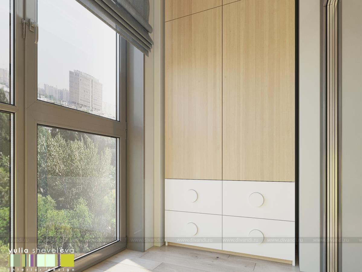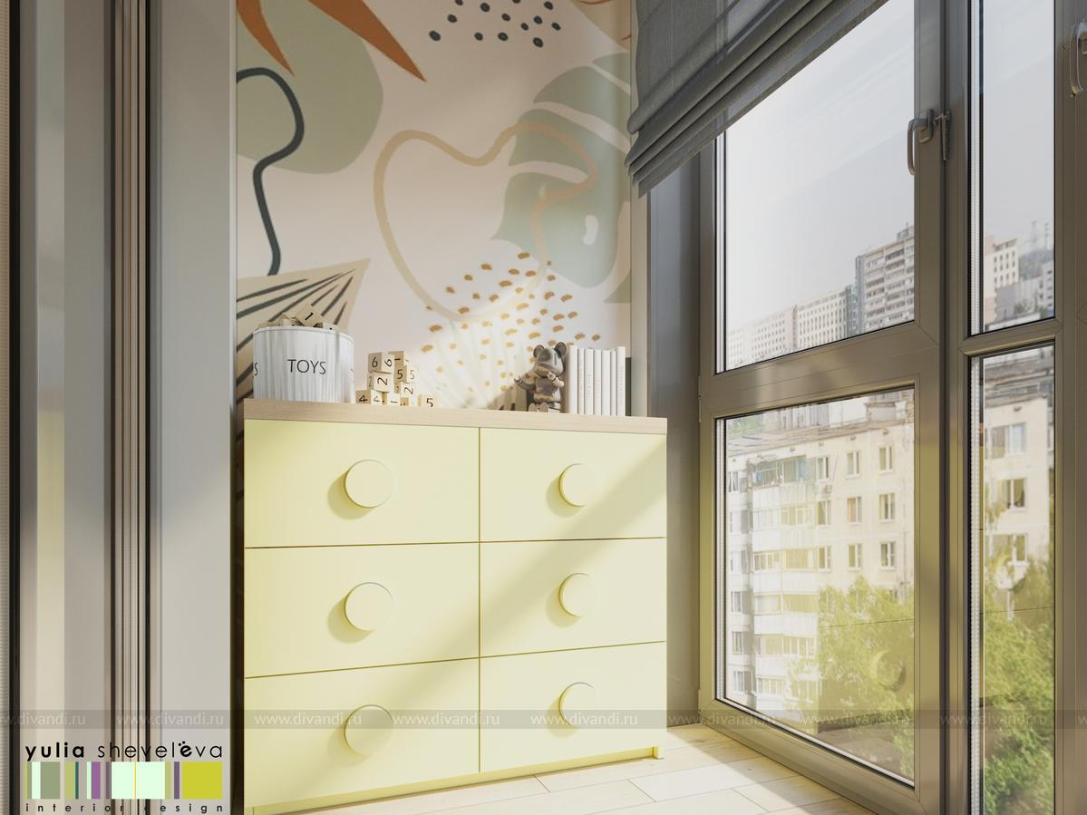 Нежная детская для девочки выполнена на перспективу, и в будущем достаточно будет только обновить декор, чтобы пространство соответствовало возрасту ребенка. Акцентом в комнате выступает очень красивая и элегантная роспись, на стене за кроватью с мягким изголовьем. Здесь же разместили акцентные бра, которые добавили глубины пространству. На панорамной лоджии разместили дополнительные системы хранения.