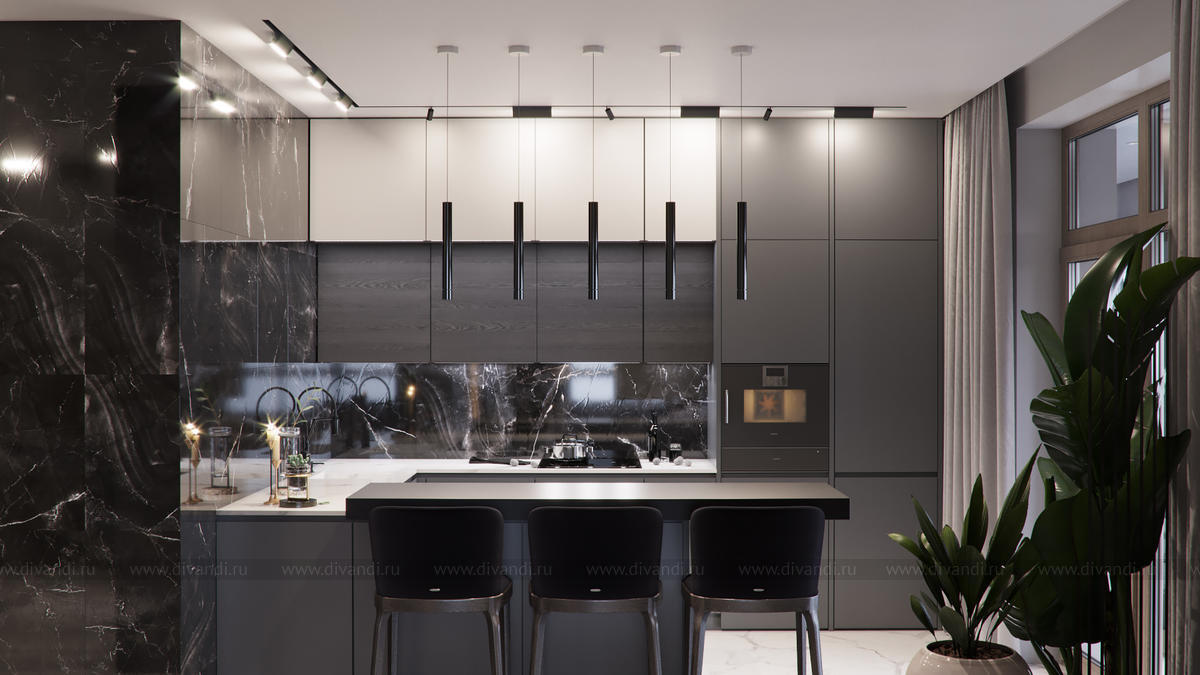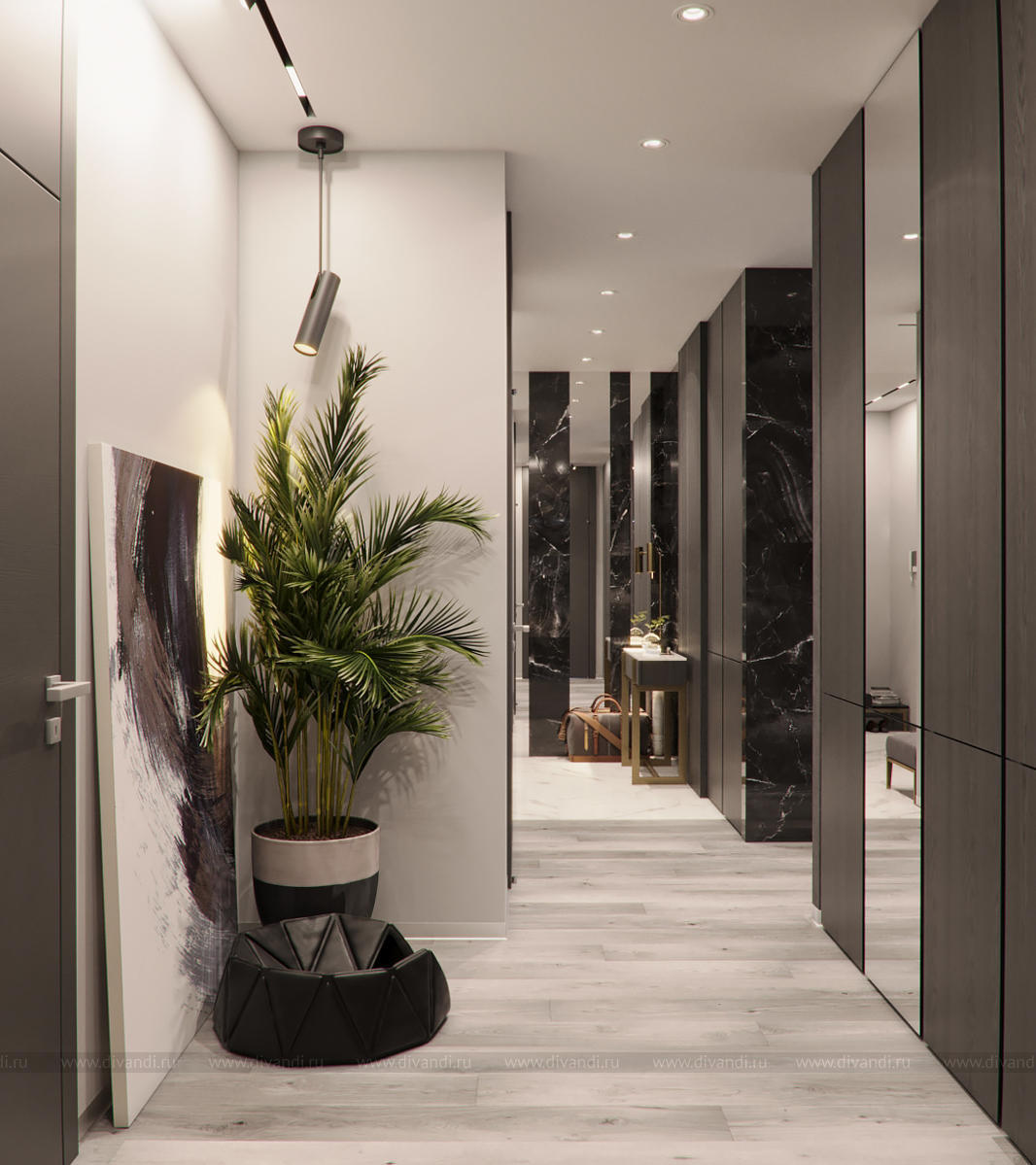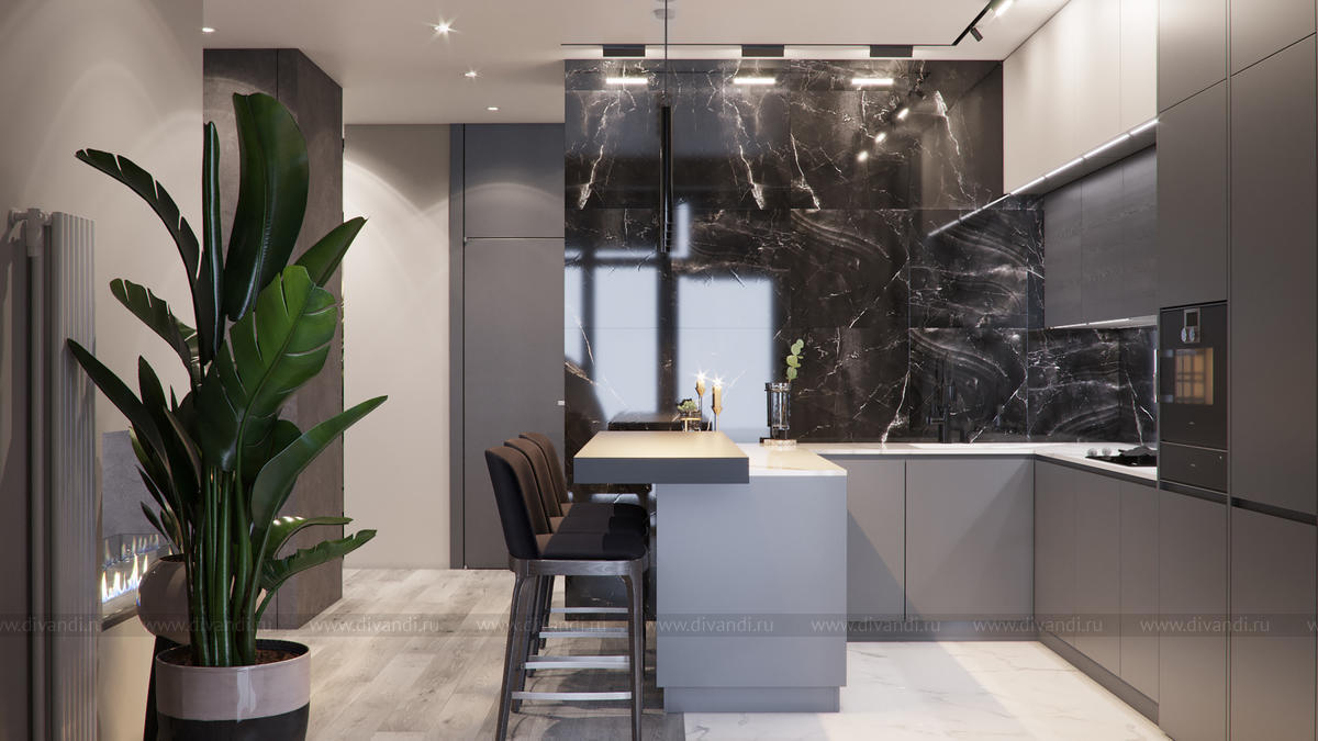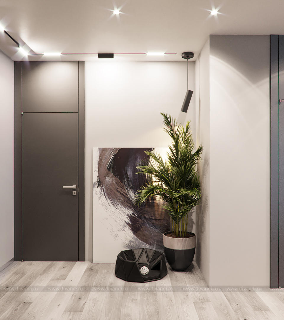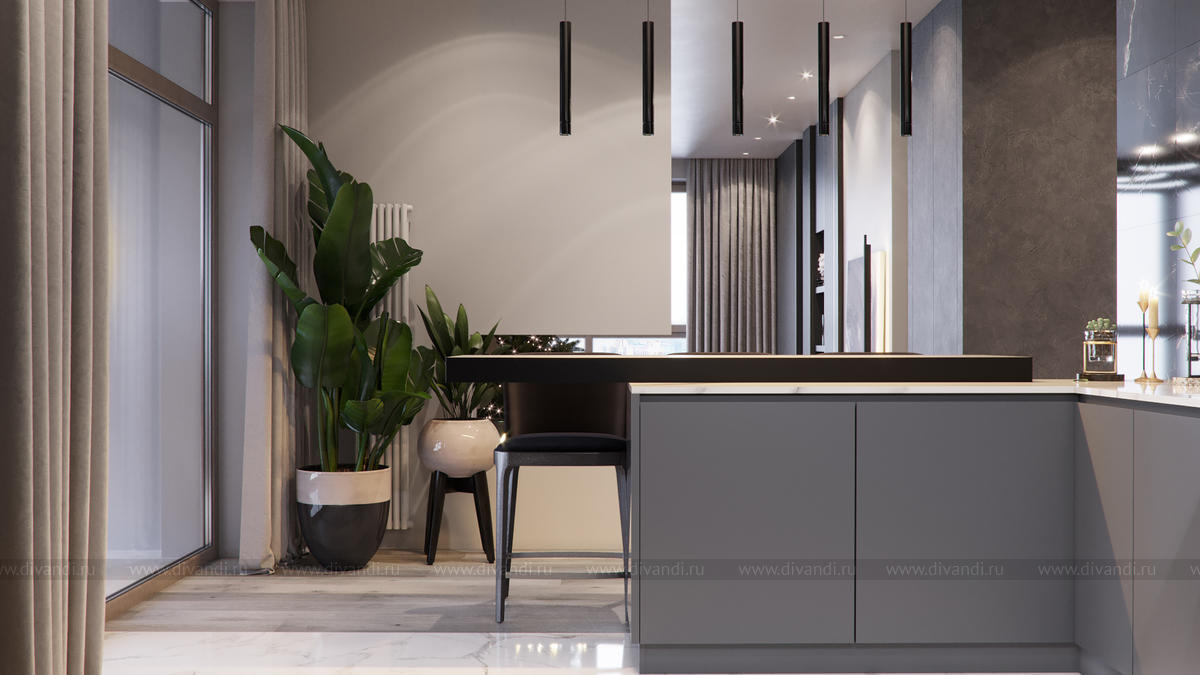 Минималистичный дизайн квартиры в ЖК Макаровский квартал выполнен в серой гамме без кричащих элементов и ярких цветов. Чтобы разбавить общую монохромную палитру помещения, интерьер наполнен контрастными деталями такими как, картины, цветы и растения, равномерно и точечно добавленных в пространство. Прямые формы, сложные оттенки делают помещение максимально стильным, лаконичным и взрослым. Использование в дизайне мрамора, дерева и металла добавляют интерьеру изысканности, шарма и лоска, где каждый элемент находится на своем месте без каких-либо излишеств.