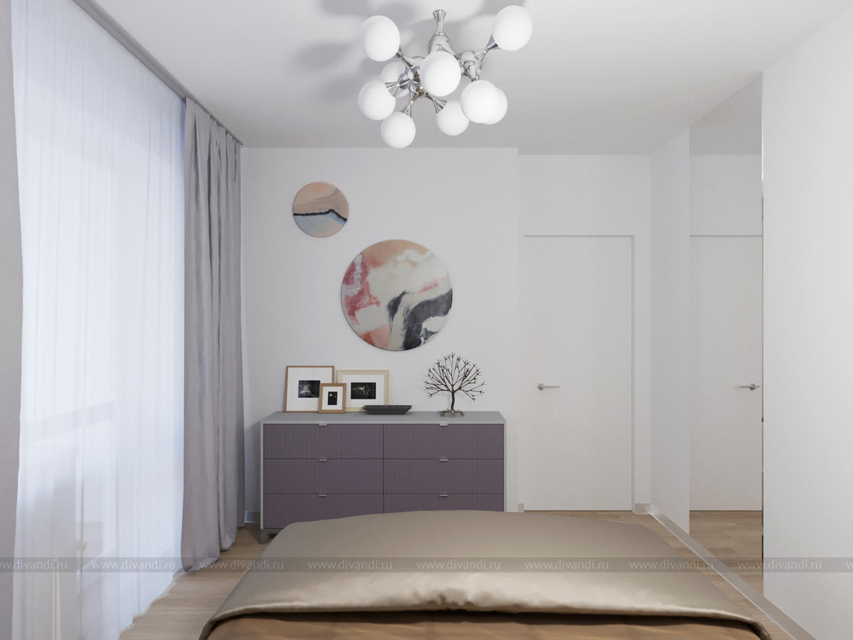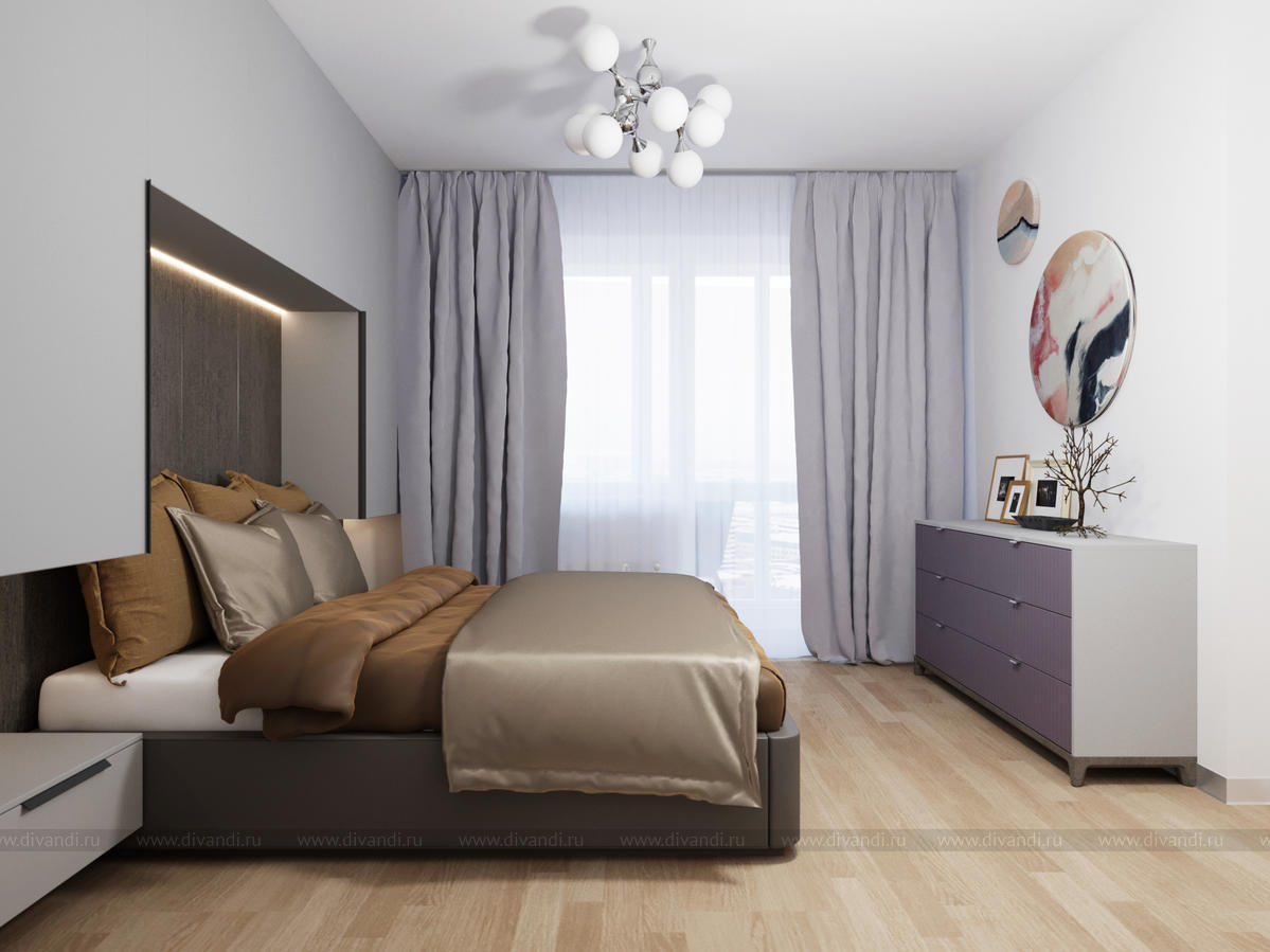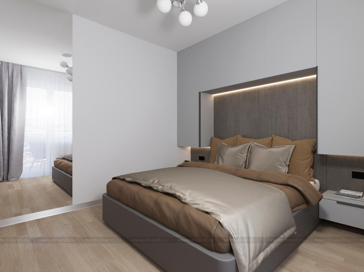 Спальня, оборудованная дополнительными местами для хранения в изголовье кровати.