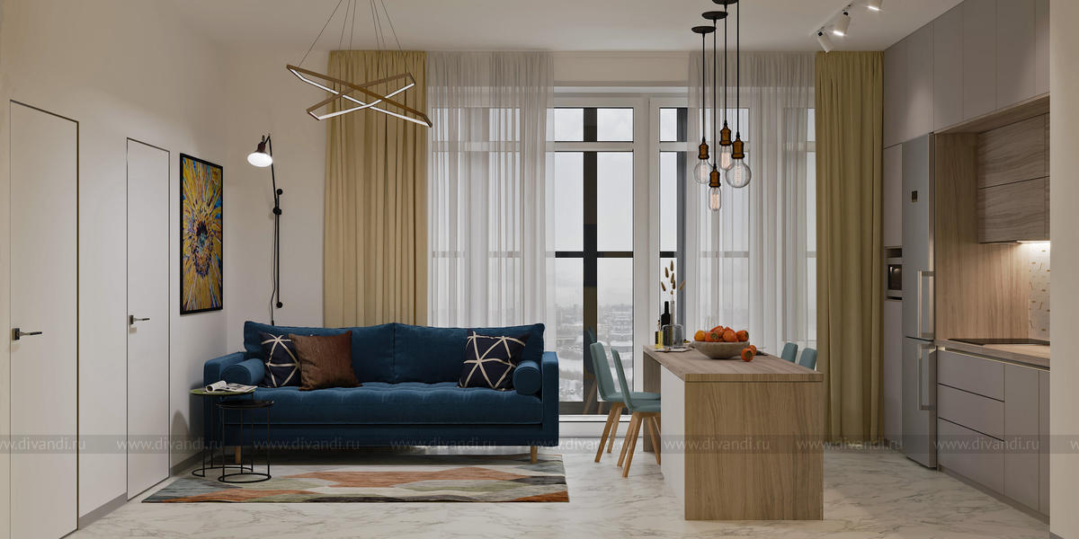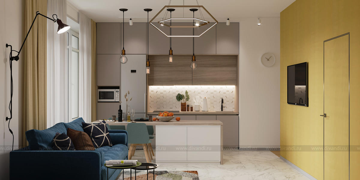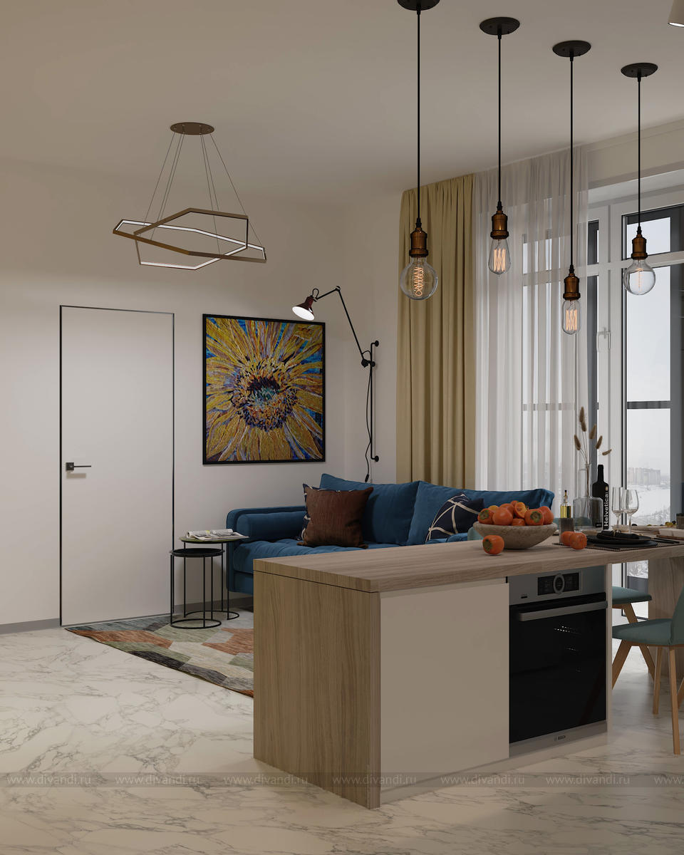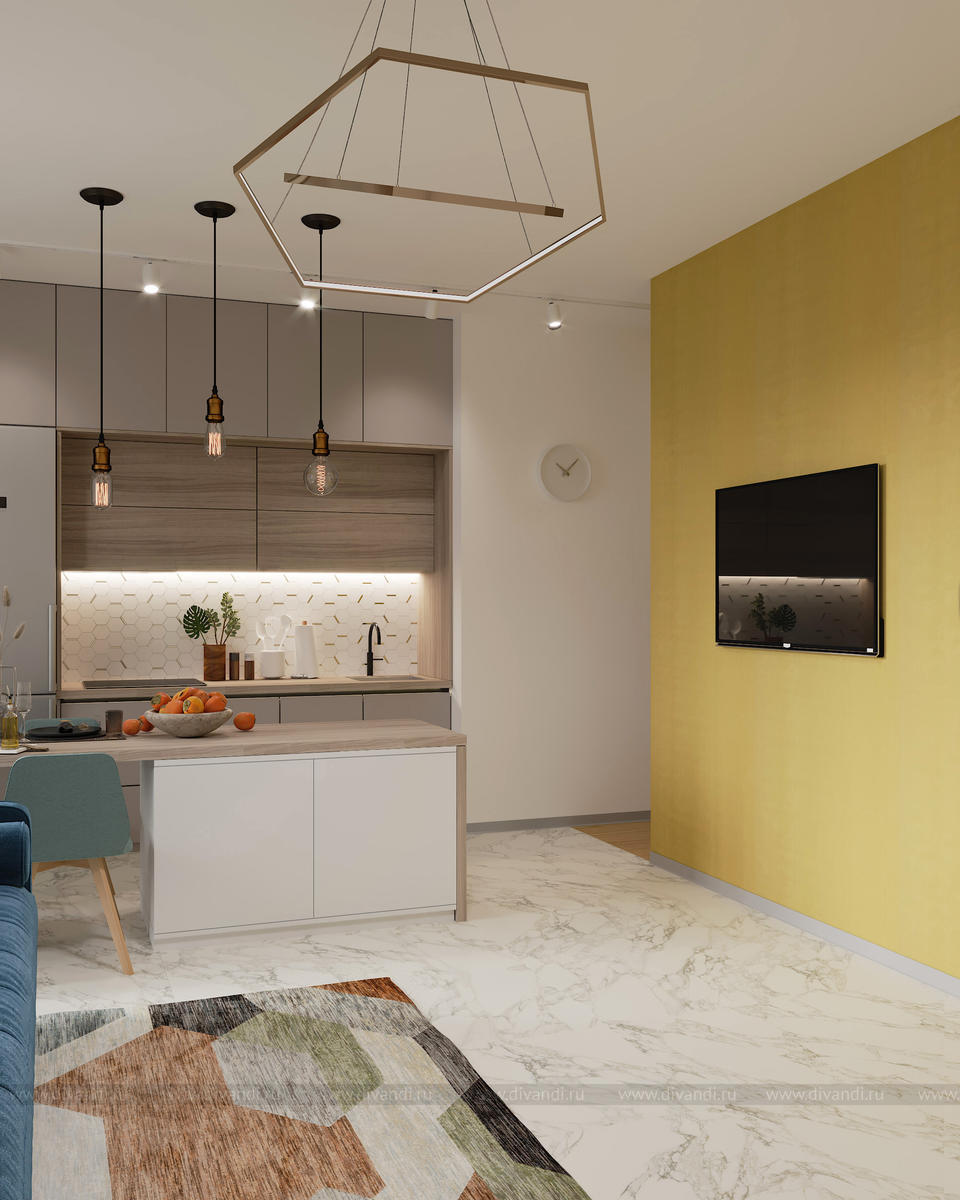 В итоге спланировали кухонный остров таким образом, что он переходит в обеденный стол. Разместили диван и напротив него телевизор. Также зону холла сделали открытой.