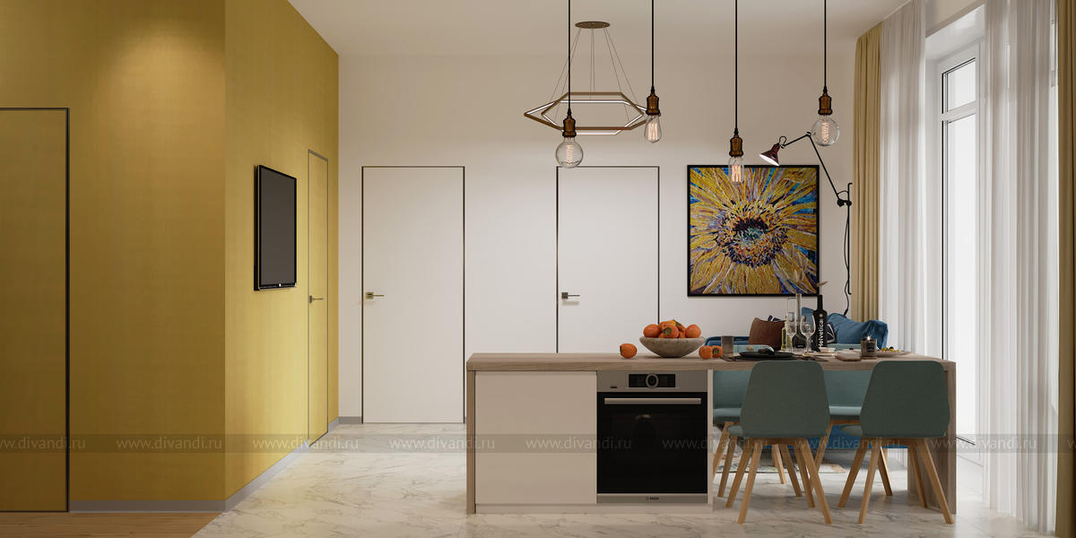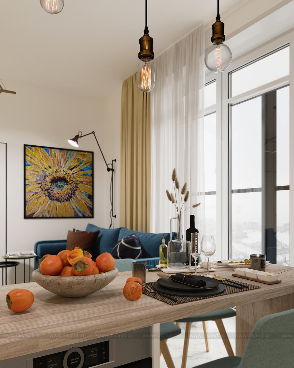 Встала сложная задача на небольшом пространстве разместить полноценный кухонный гарнитур со столом и зону гостиной. Также вписать картину заказчиков "Подсолнухи"