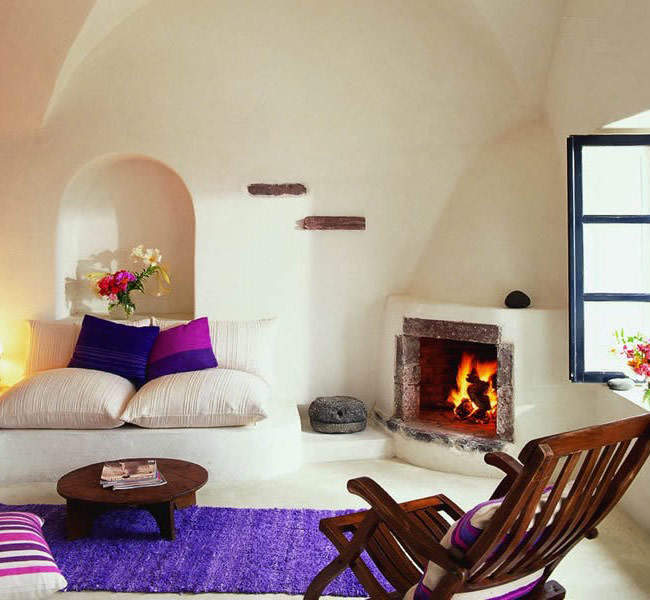 В греческом доме огромное внимание уделяется уюту и очагу. Здесь вы можете видеть гостиные, которые обязательно оснащены камином с диванами вокруг него. В городской квартире вы можете сделать фальш-камин, поставить электрический или же сделать центром композиции декоративный комод. Подойдет, конечно же, и тумба для телевизора, но тогда стоит постараться украсить стену за ней камнем или коричневой (бело-синей) мозаикой.
