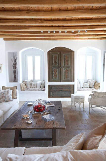 Для греческого дома характерны узкие, маленькие окна, в гостиной их обычно 2 или 4. В старых деревенских домах у нас также прослеживается данная тенденция, поэтому этот стиль идеален для реконструкции старой избы или дачи. Балки зачастую остаются в таком случае нетронутыми, но основательно подчищаются.