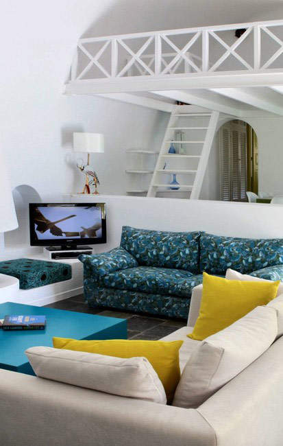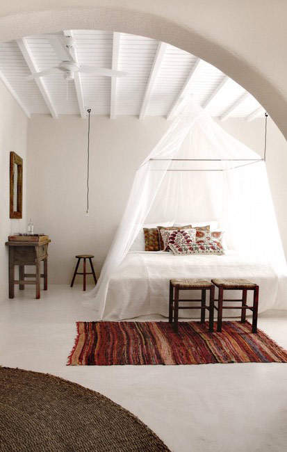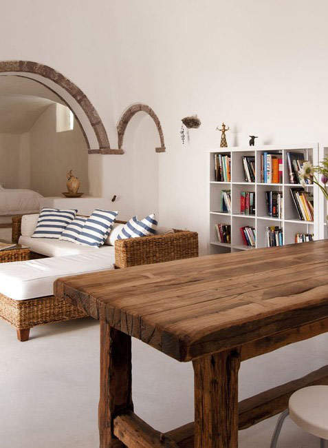 В квартире для создания греческой атмосферы очень важны две вещи — изогнутые линии (арки, альковы над кроватью, дуги, повторяющиеся на предметах мебели) и натуральное дерево. Эти две вещи помогут вам создать этнический интерьер, а не просто бело-синий. Последний цвет вовсе не обязательно использовать в больших количествах — пары ваз, подушек и картины хватит, чтобы создать нужный эффект.