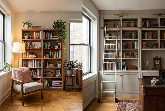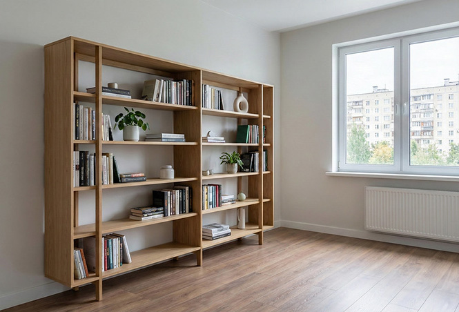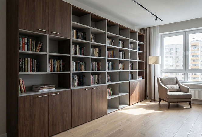 Обычный книжный шкаф, напротив, чаще служит элементом повседневного интерьера. Он может находиться в любой комнате — от спальни до прихожей — и используется не только для хранения книг, но и для размещения других предметов: посуды, сувениров, документов или даже одежды. Его конструкция проще, материалы — более доступные (ЛДСП, МДФ), а дизайн ориентирован на универсальность и сочетаемость с другой мебелью.