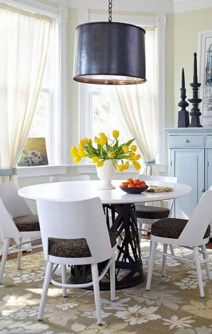 Четвертая идея — обычная обеденная группа двигается в эркер. Это самый экономный и при этом очень простой в осуществлении вариант. Разнообразить идею можно, купив не стулья, а кресла к обеденному столу для повышенной комфортности.
