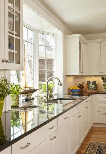 Пятая, и наша последняя, идея — расположение в эркере рабочего кухонного гарнитура, используя по максимуму свет из окна для освещения рабочих поверхностей. Здесь можно, и даже почти обязательно, установить раковину — тогда хозяйка сможет, любуясь садом, заниматься мытьем посуды.