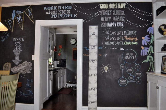 Очень редко надписи используются на кухне, так как здесь самым модным трендом в смежной сфере является установка настенной доски, на которой можно писать мелом. Размер ее может составлять всего лишь 10×10 сантиметров, или она может занимать всю стену.