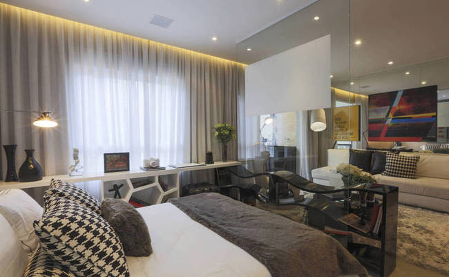 Обычно зонирование однокомнатной квартиры в стиле бразильяно происходит простым способом – две зоны (гостиная и спальня) располагаются напротив друг-друга в разных концах комнаты, а между ними устанавливается экран с TV, который способен быть повернут как в одну, так и в другую сторону. Иногда для зонирования используются стеллажи, полки, пуфики, столики, стеклянные экраны и текстиль, но главное – это лаконичность всех линий и оттенков, позволяющая сделать насыщенный интерьер светлым и легким на вид.