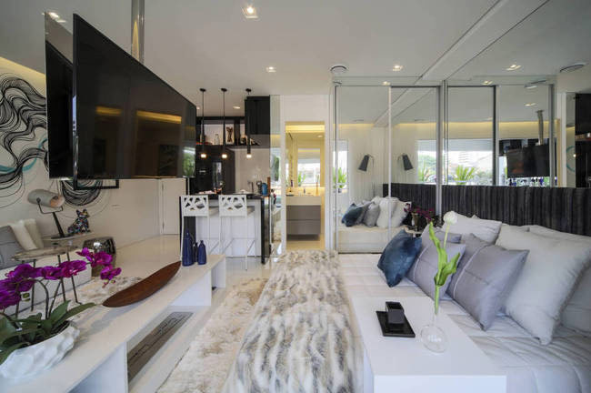 В стиле бразильяно есть и еще одна очень важная особенность – характерное зонирование и расстановка мебели, которые позволяют в квартире площадью 30 квадратных метров организовать райский оазис на двоих! Разве не здорово?